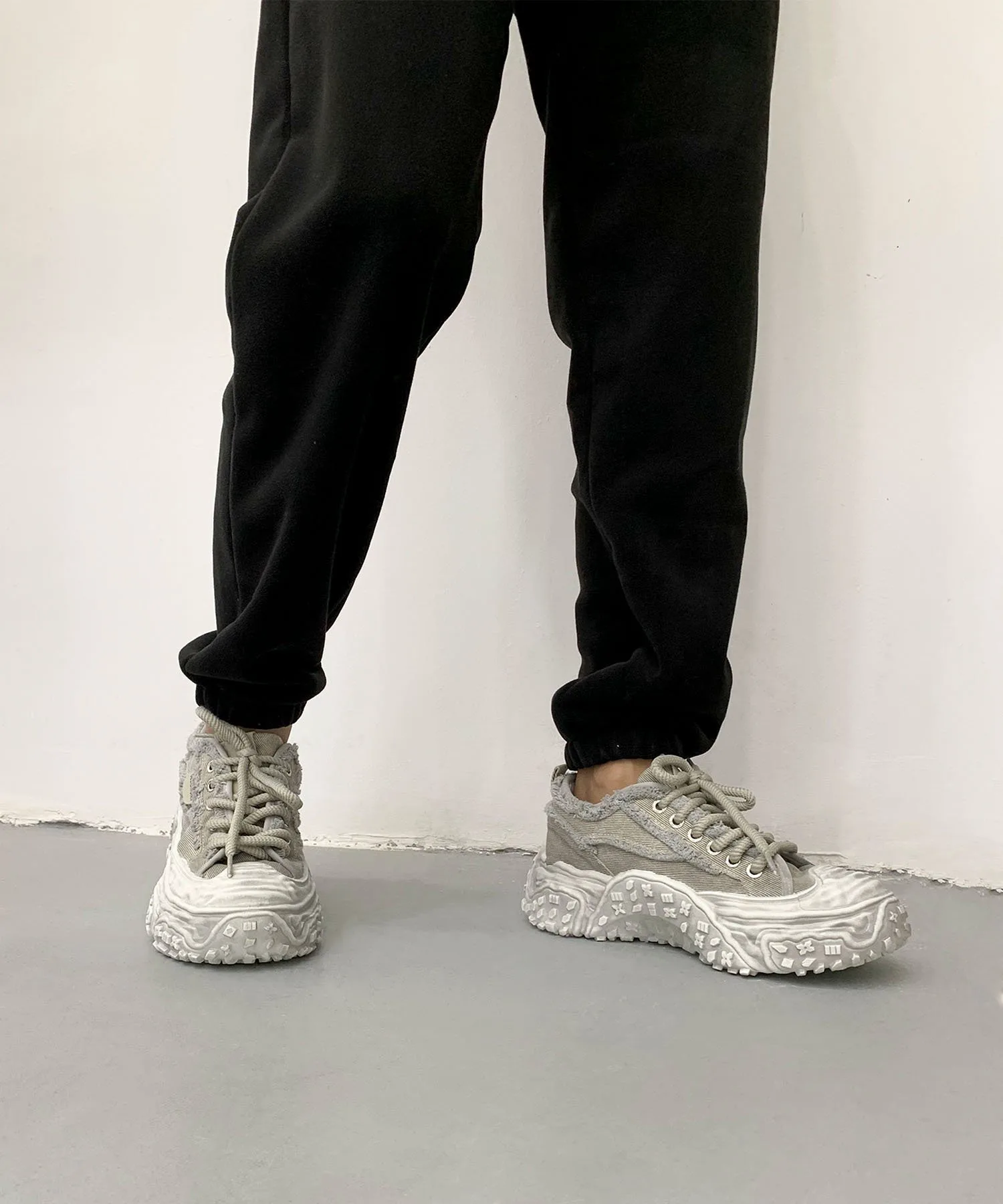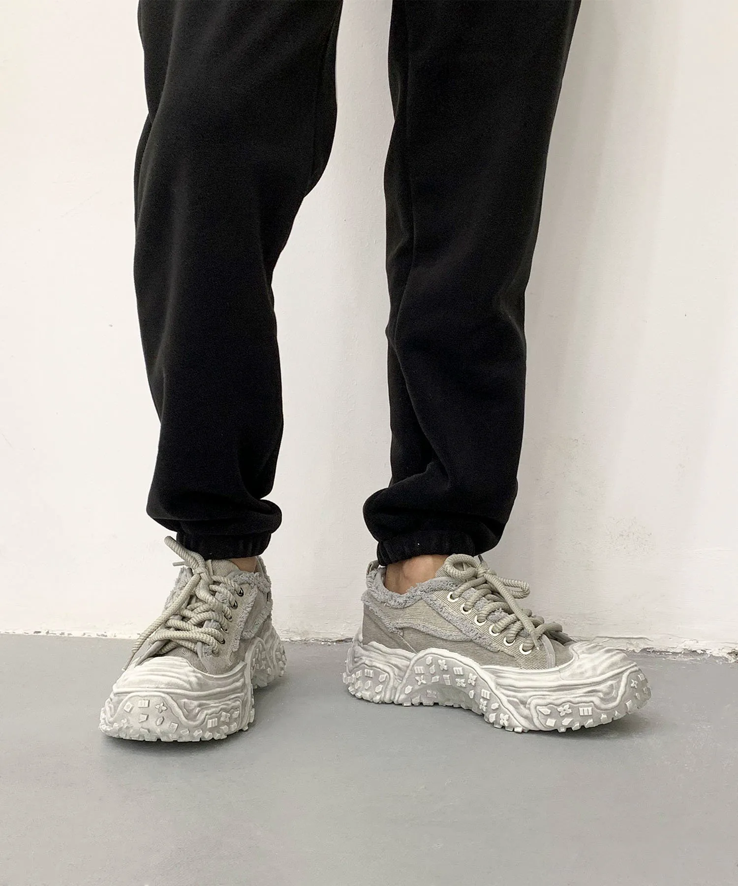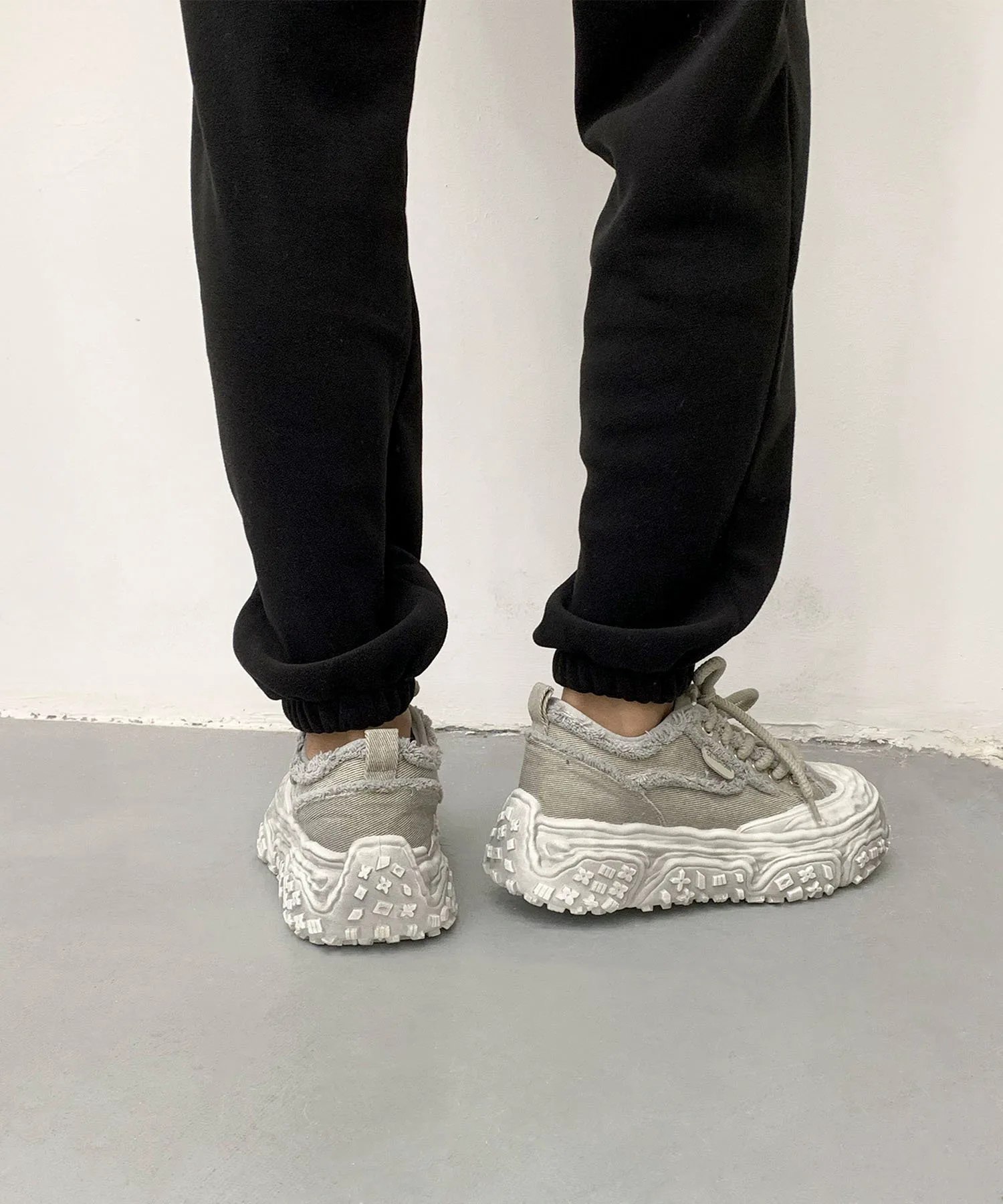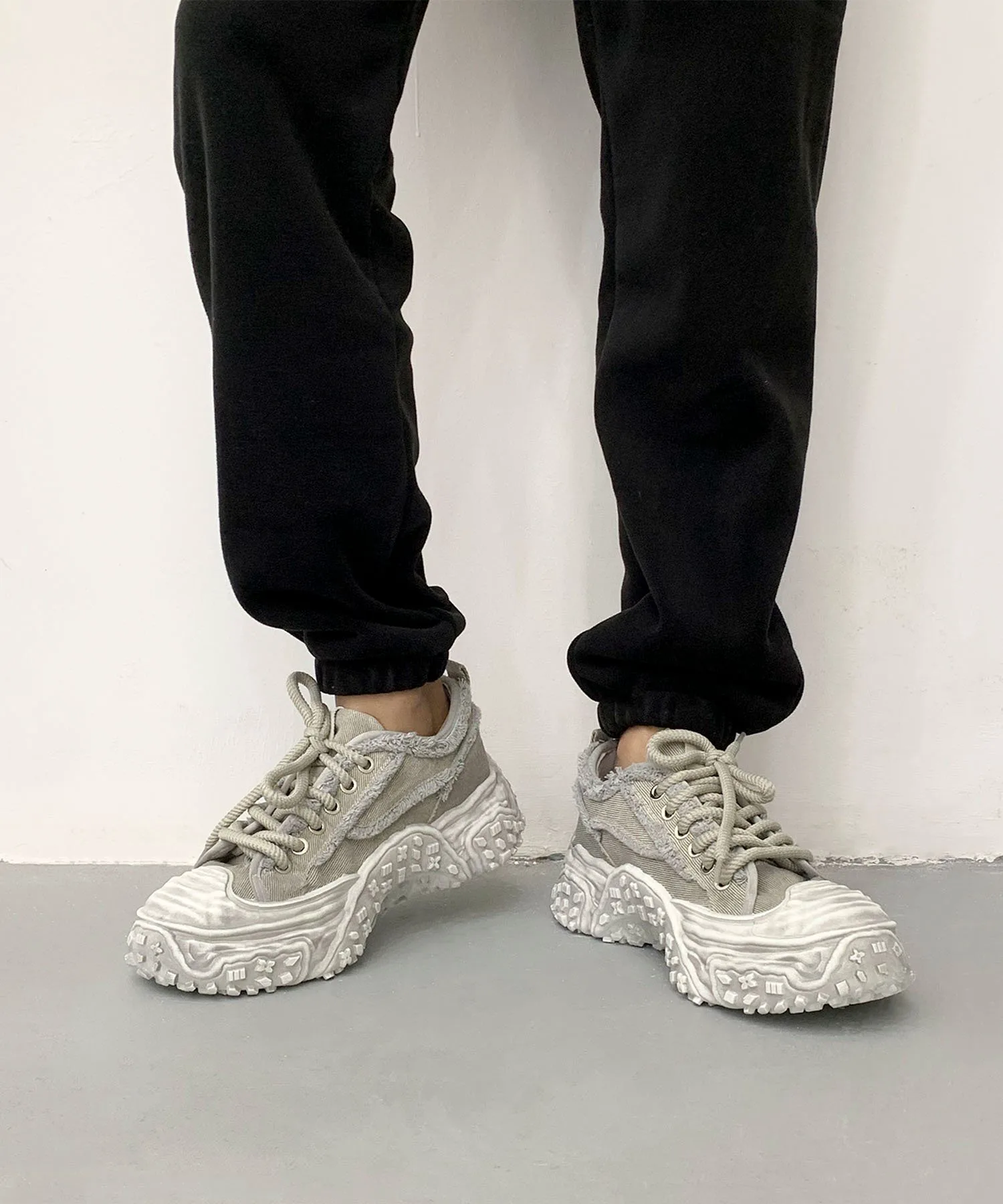 Пара джинсовых кроссовок на платформе с эффектом потертости, которые привлекут ваше внимание своим уникальным дизайном.