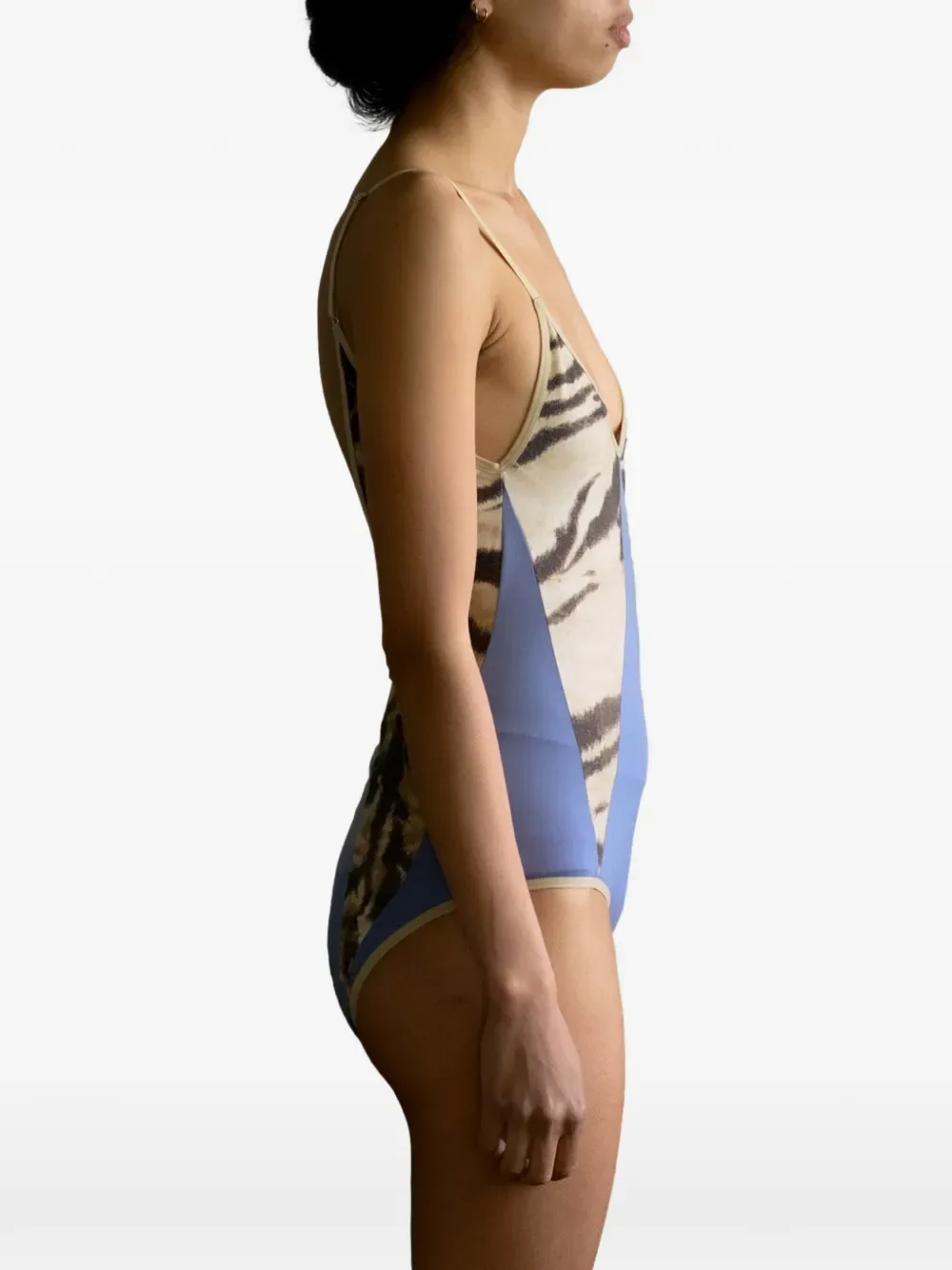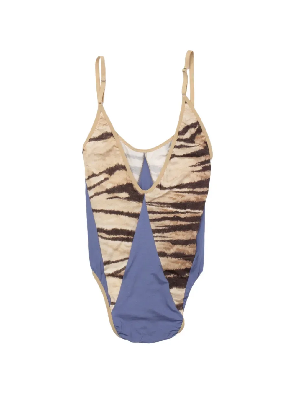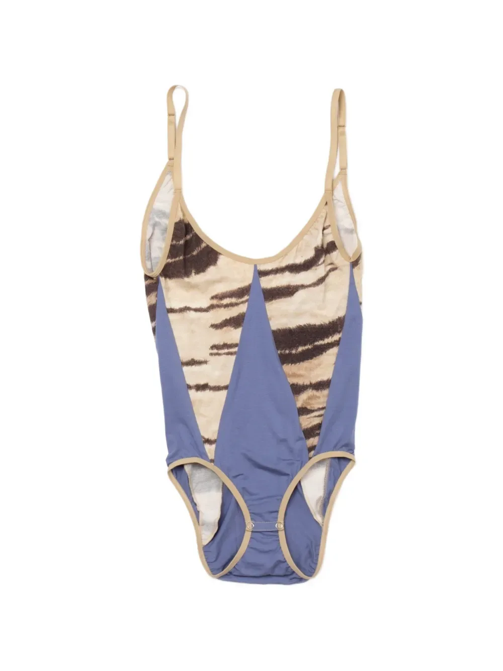 Синий тигровый узор, регулируемые бретели, V-образный вырез, треугольные вставки, вырез на спине. Напоминаем, что эту вещь необходимо примерять поверх собственной одежды.