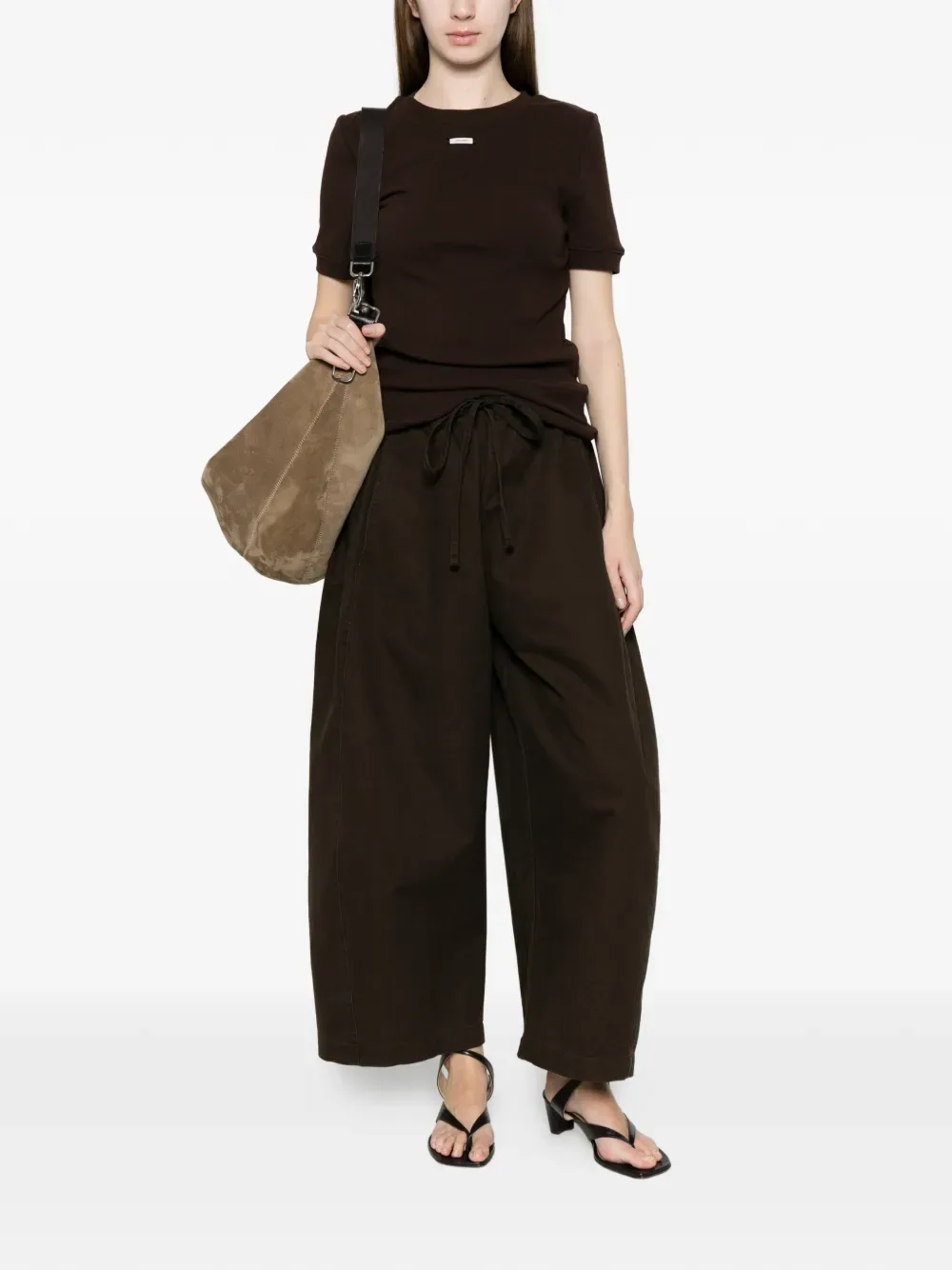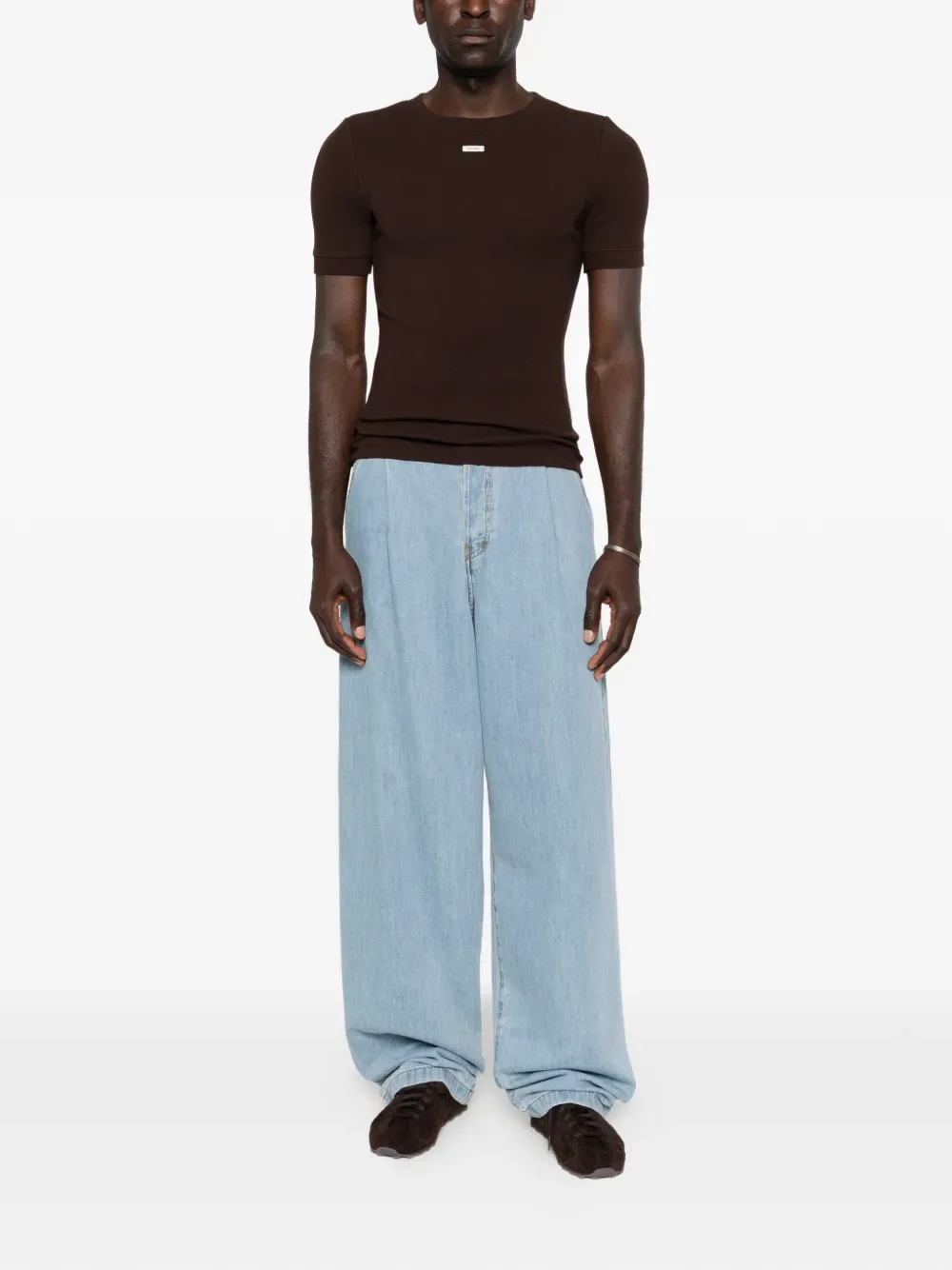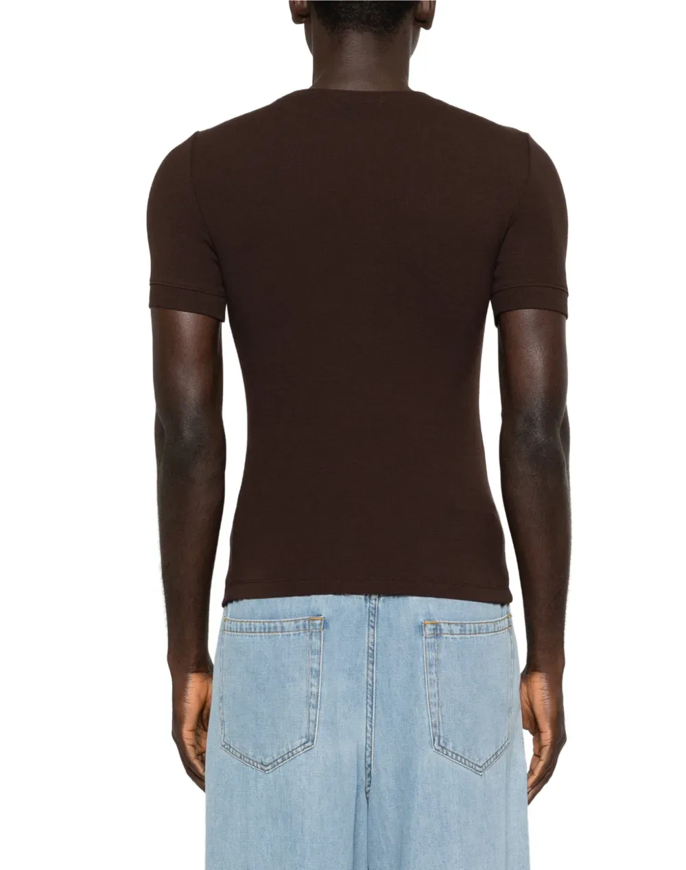 Коричневая футболка с короткими рукавами, круглым вырезом и логотипом на ярлыке