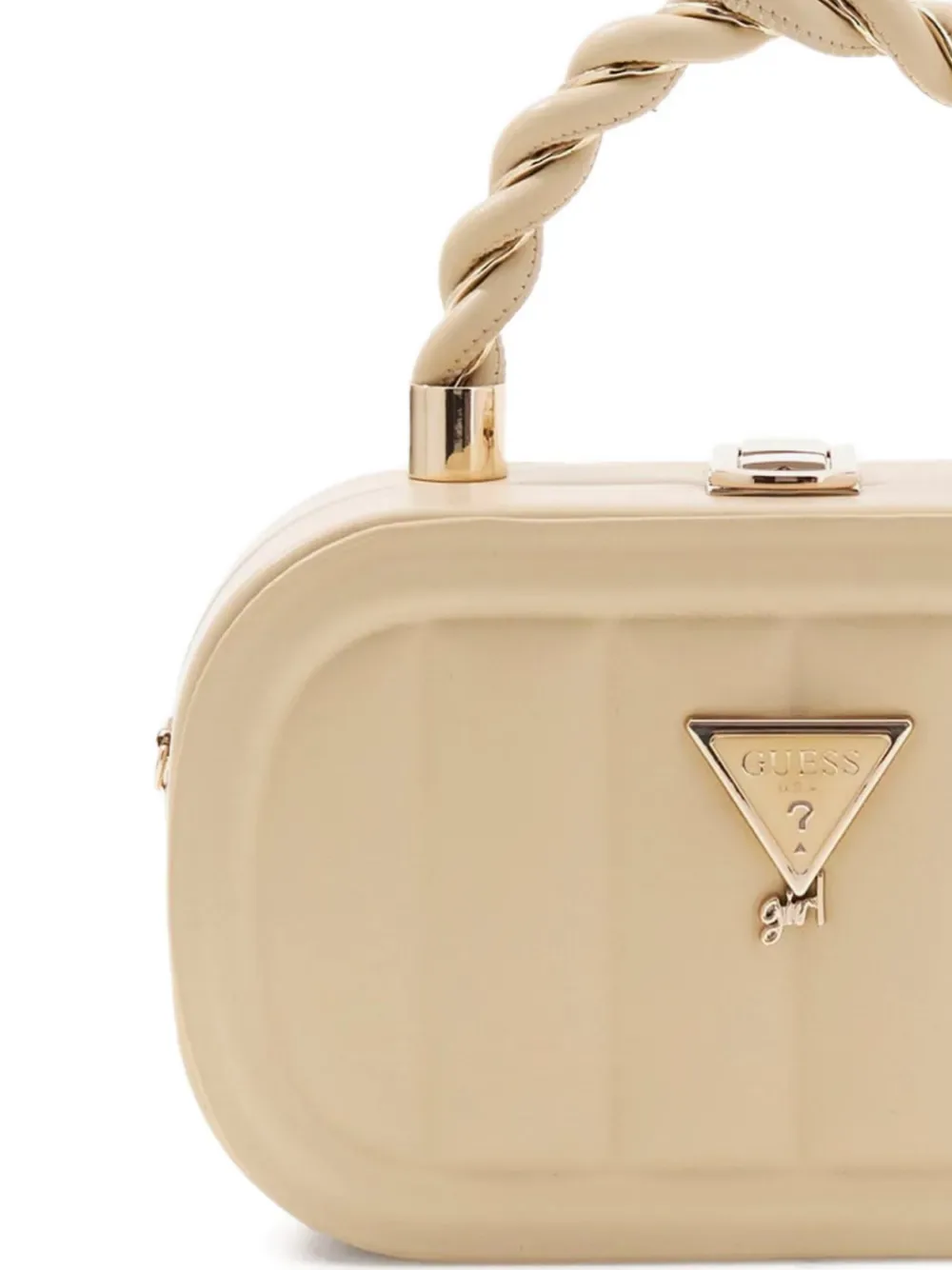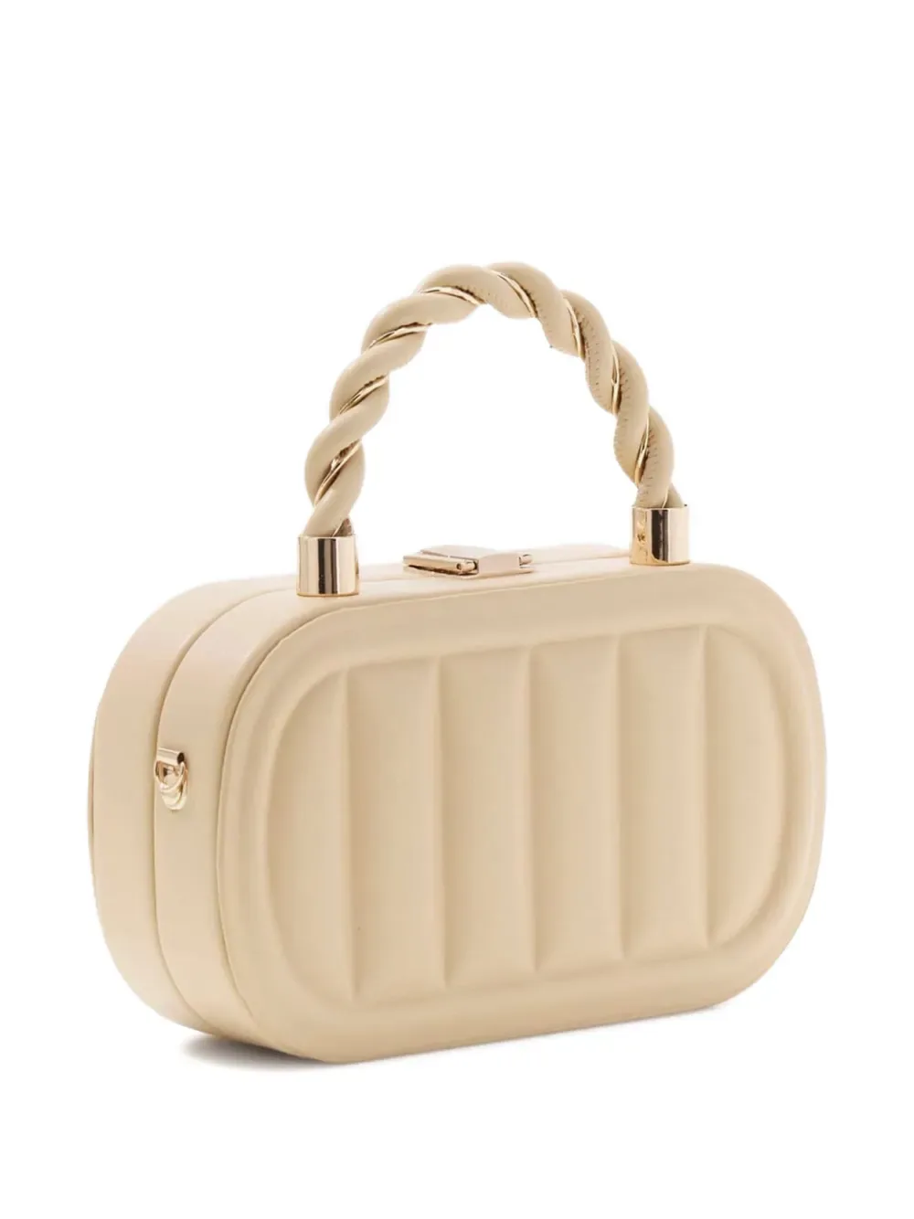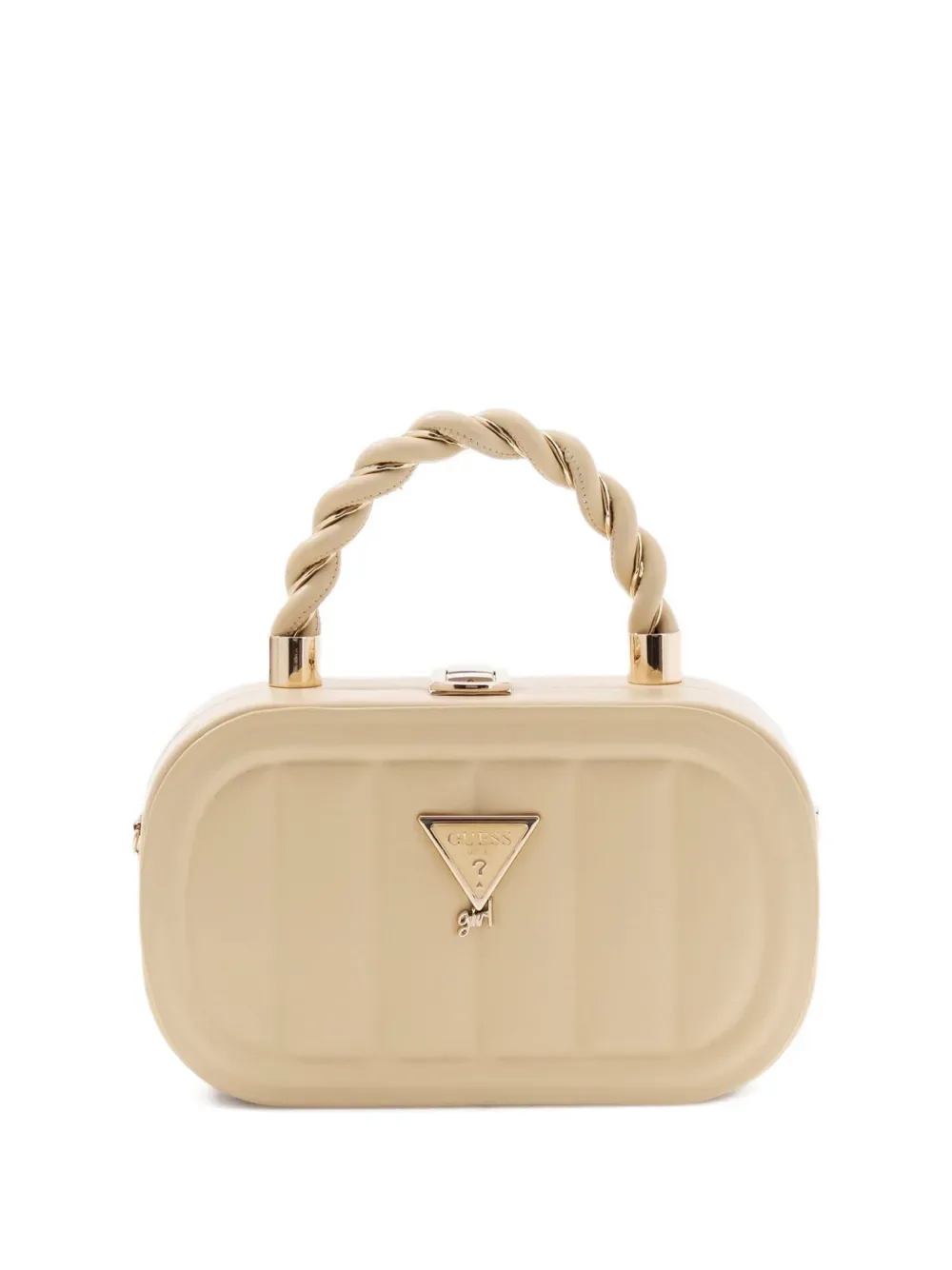 Бежевый скрученный верх с ручкой, логотипная табличка, застежка-защелка, основное отделение, фурнитура цвета золота