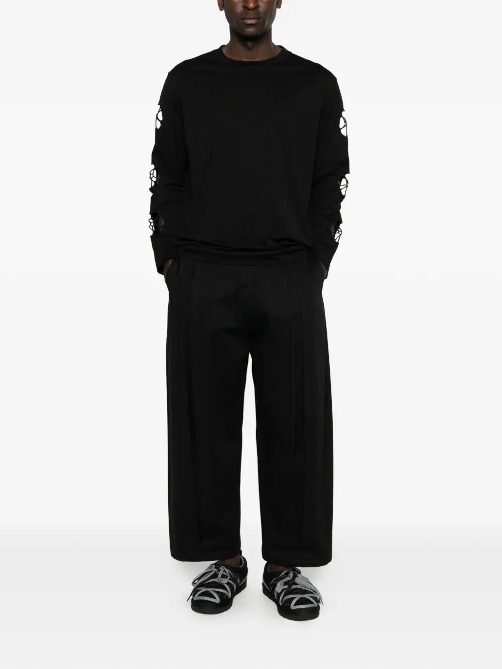 Черный топ с круглым вырезом, длинными рукавами и вырезами