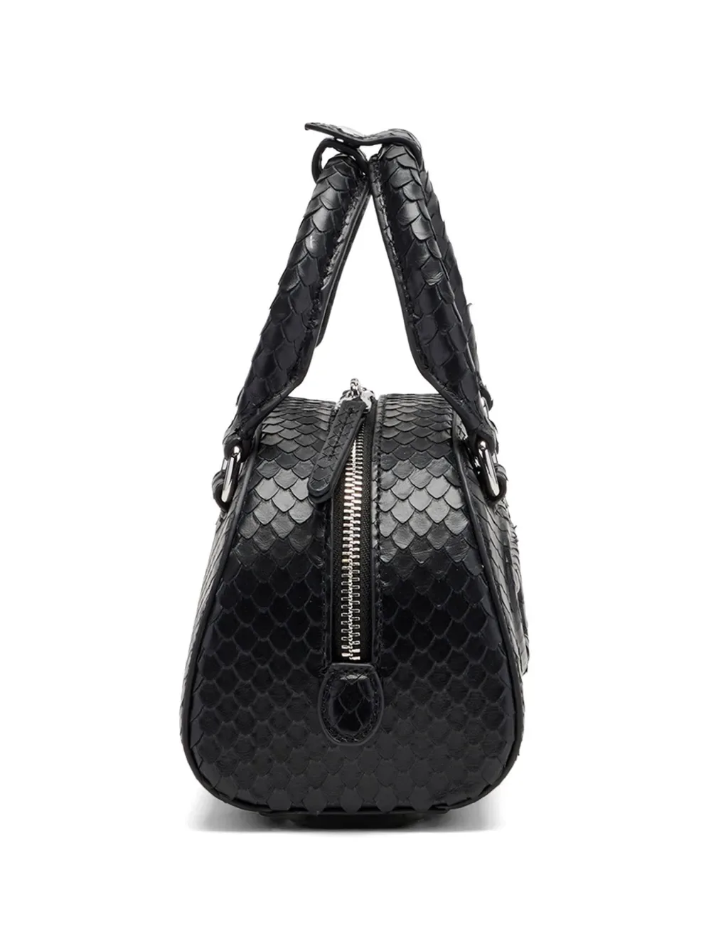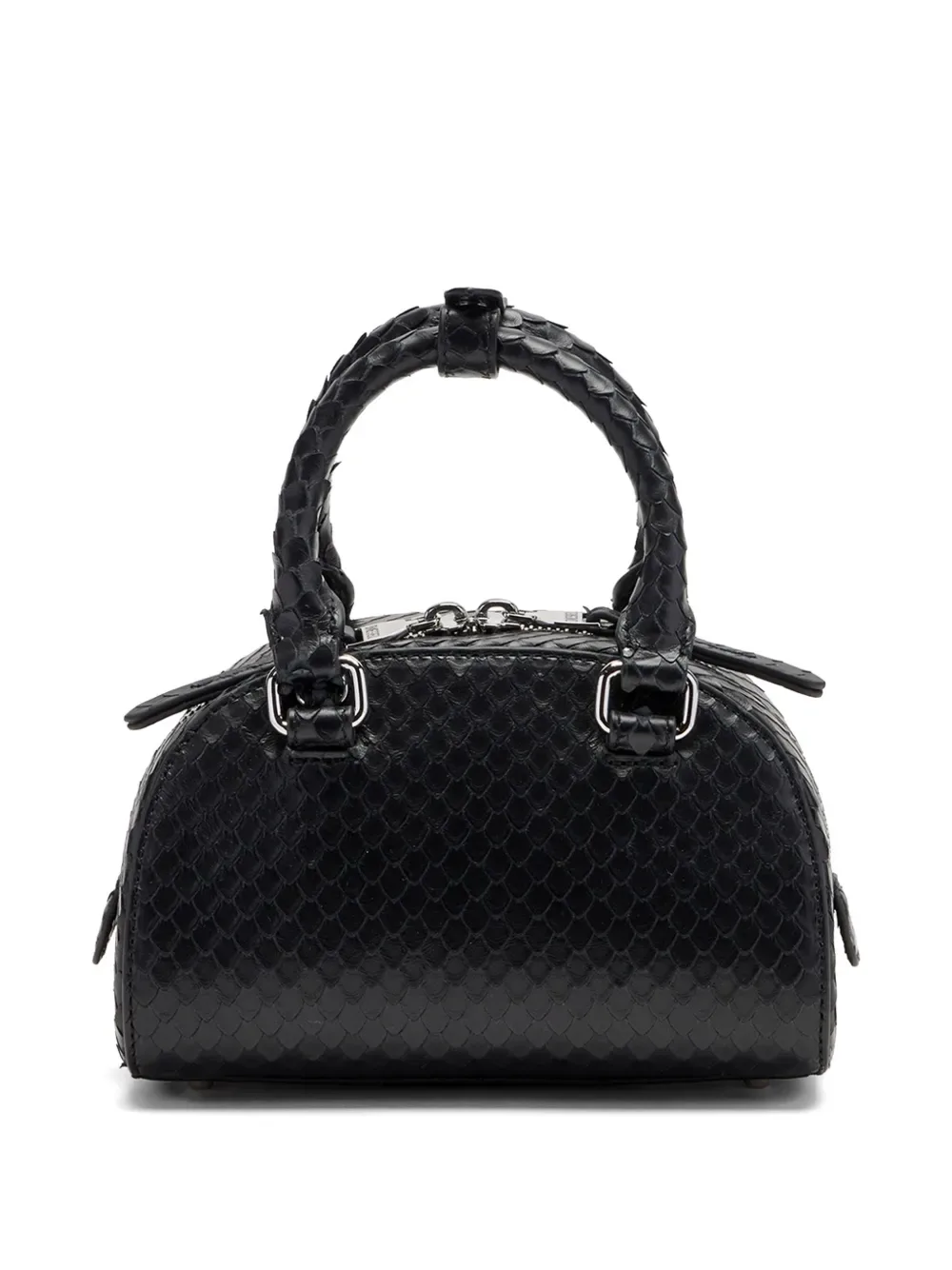 Черная фактурная отделка, фирменная овальная табличка с буквой D, две скрученные верхние ручки, застежка-молния в двух направлениях, съемный плечевой ремень, основное отделение, фурнитура серебристого оттенка