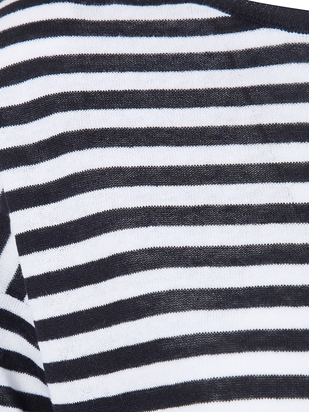Белый с черными полосками, круглый вырез, рукава три четверти, лен
