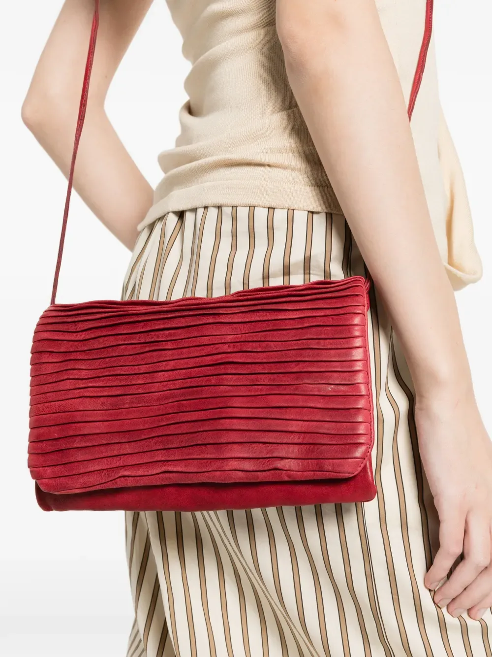 Красная овечья кожа, детали со складками, магнитная застежка, один плечевой ремень. К изделию прилагается защитный чехол.