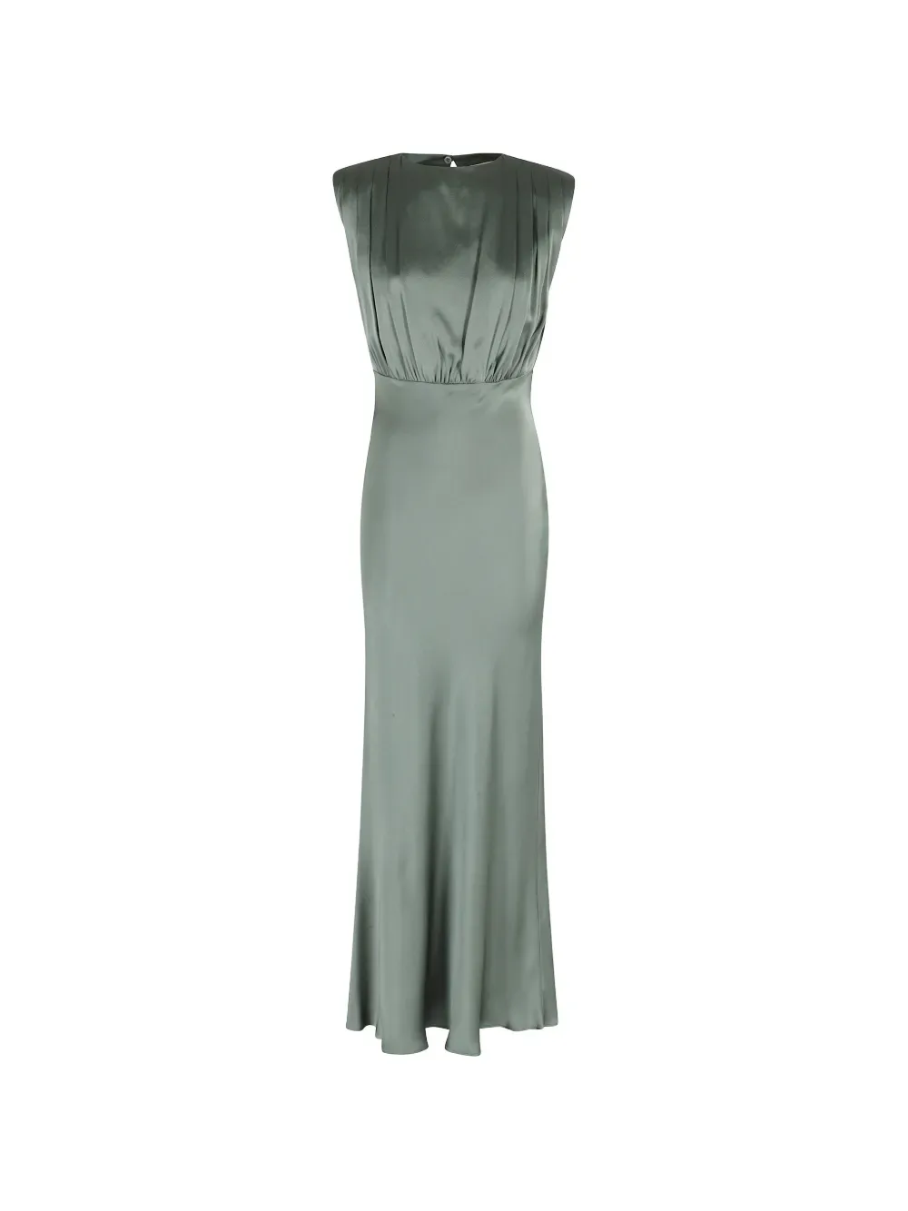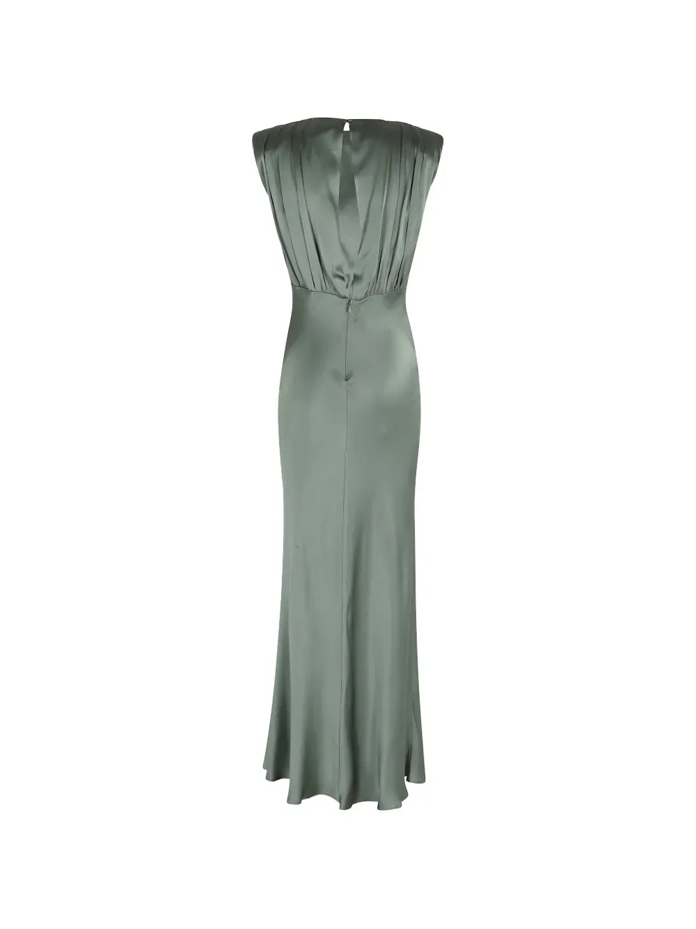 Зеленое платье без рукавов с драпировкой, застежкой-молнией сзади, круглым вырезом и приталенной талией