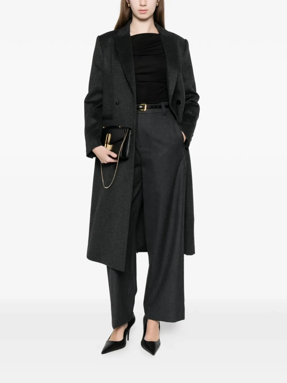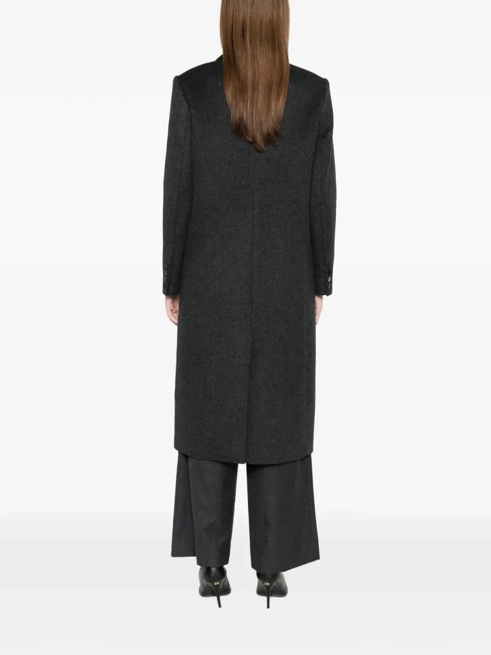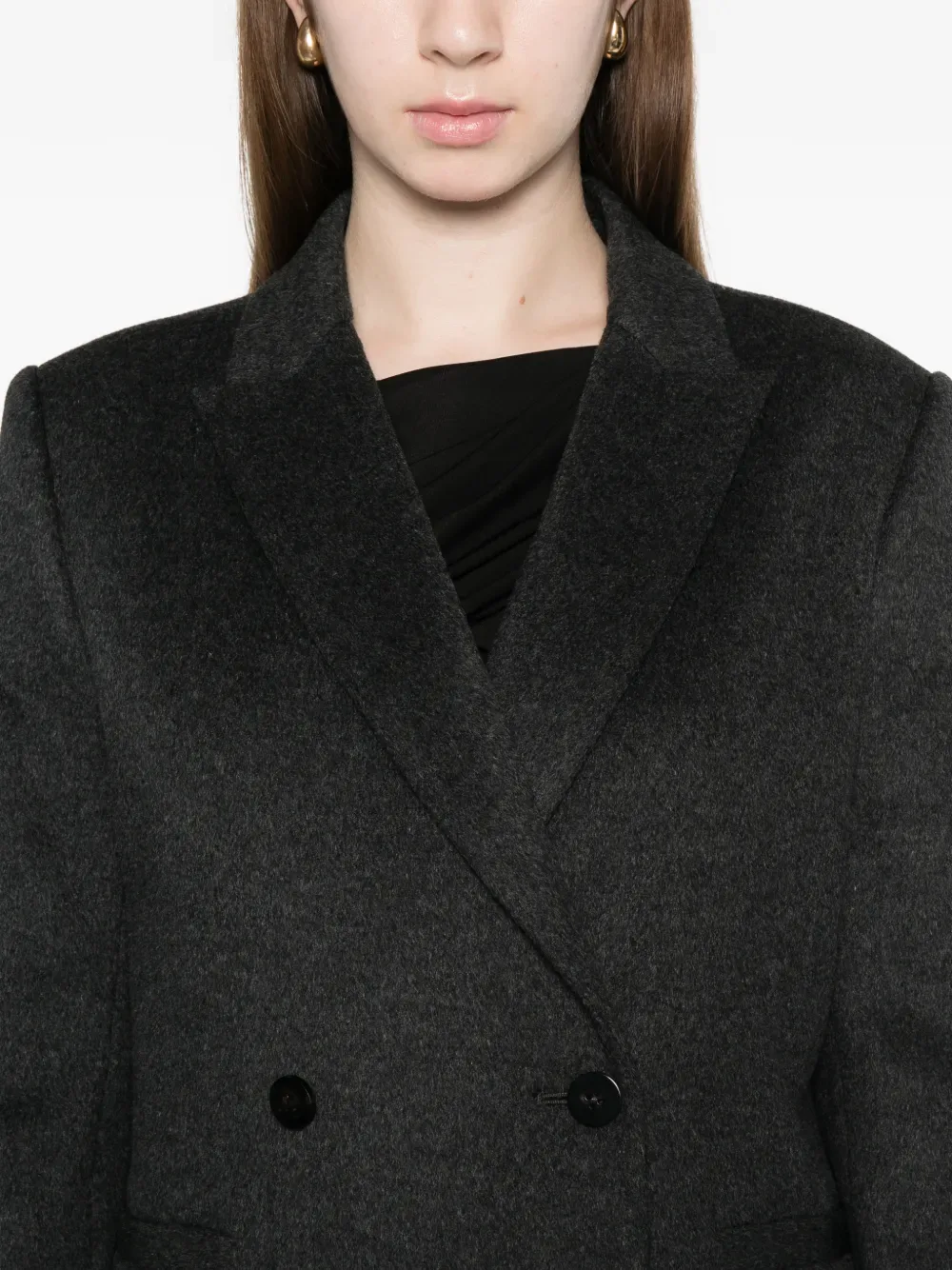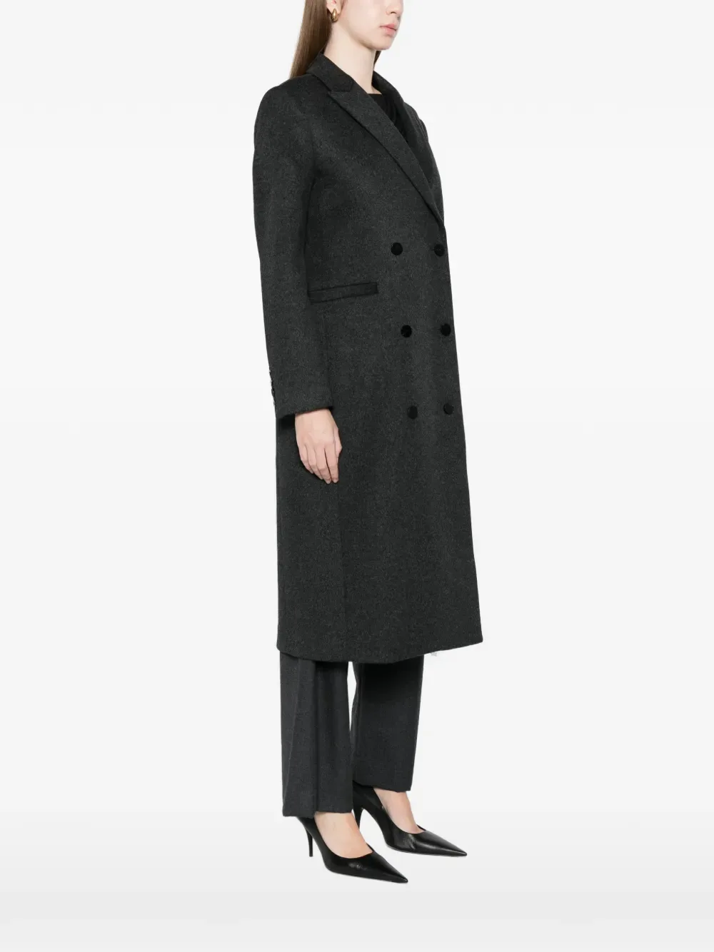 Угольно-серый двубортный пиджак с застежкой на пуговицы, лацканами с вырезом, длинными рукавами и прорезными карманами