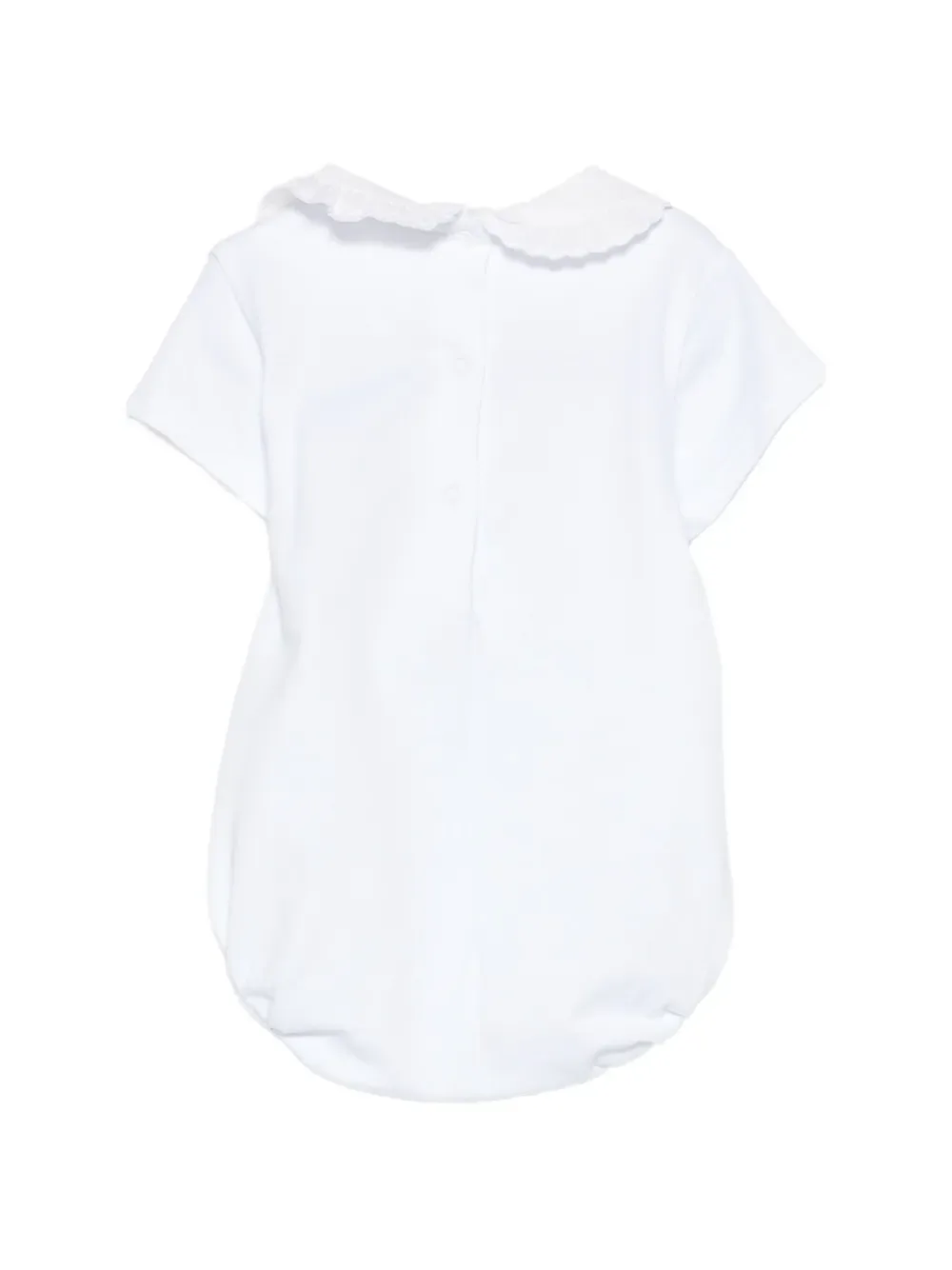 Белый воротник с рюшами, короткие рукава, застежка на пуговицы сзади