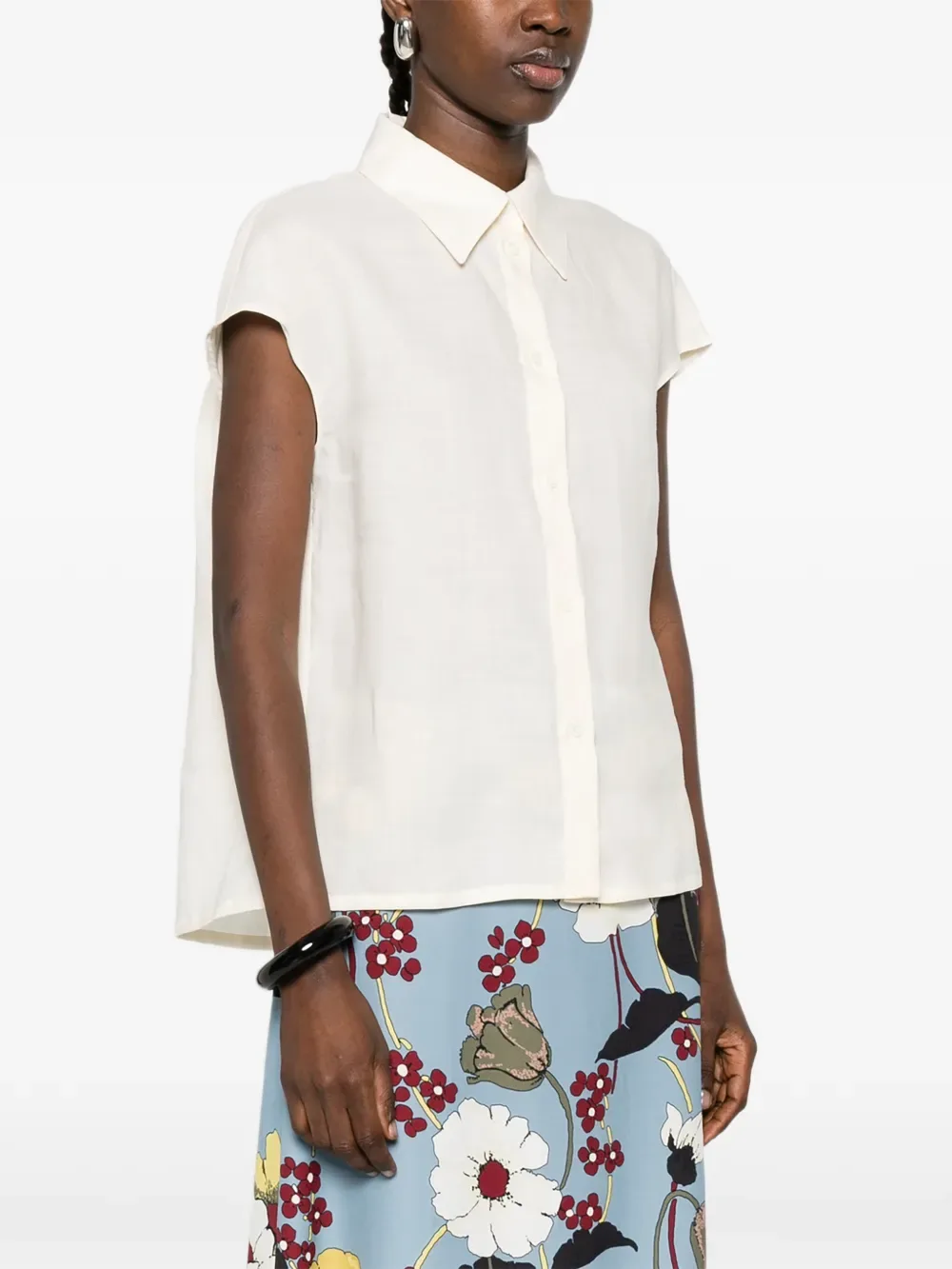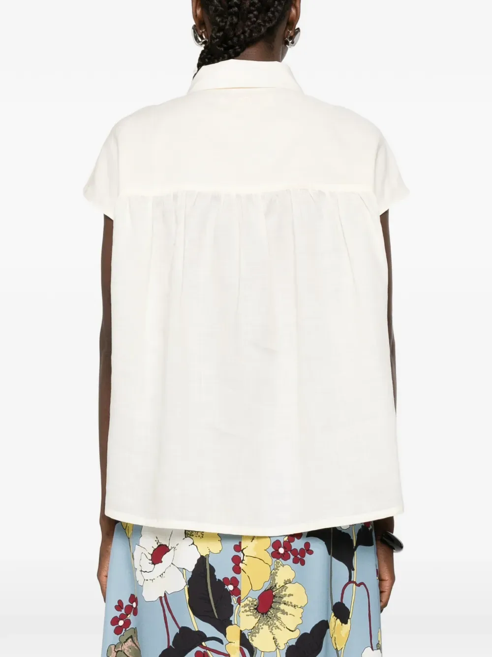 Светло-бежевый, застежка на пуговицы спереди, короткие рукава, классический воротник