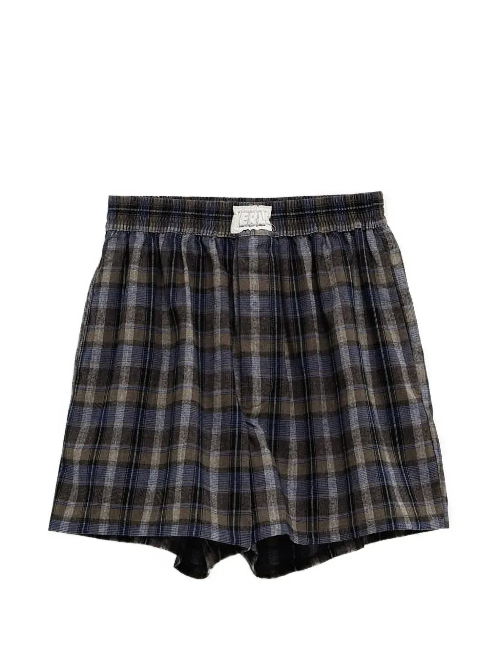 Коричнево-синий клетчатый узор, эластичный пояс. Просто напоминаем, что этот товар нужно примерять поверх собственной одежды.