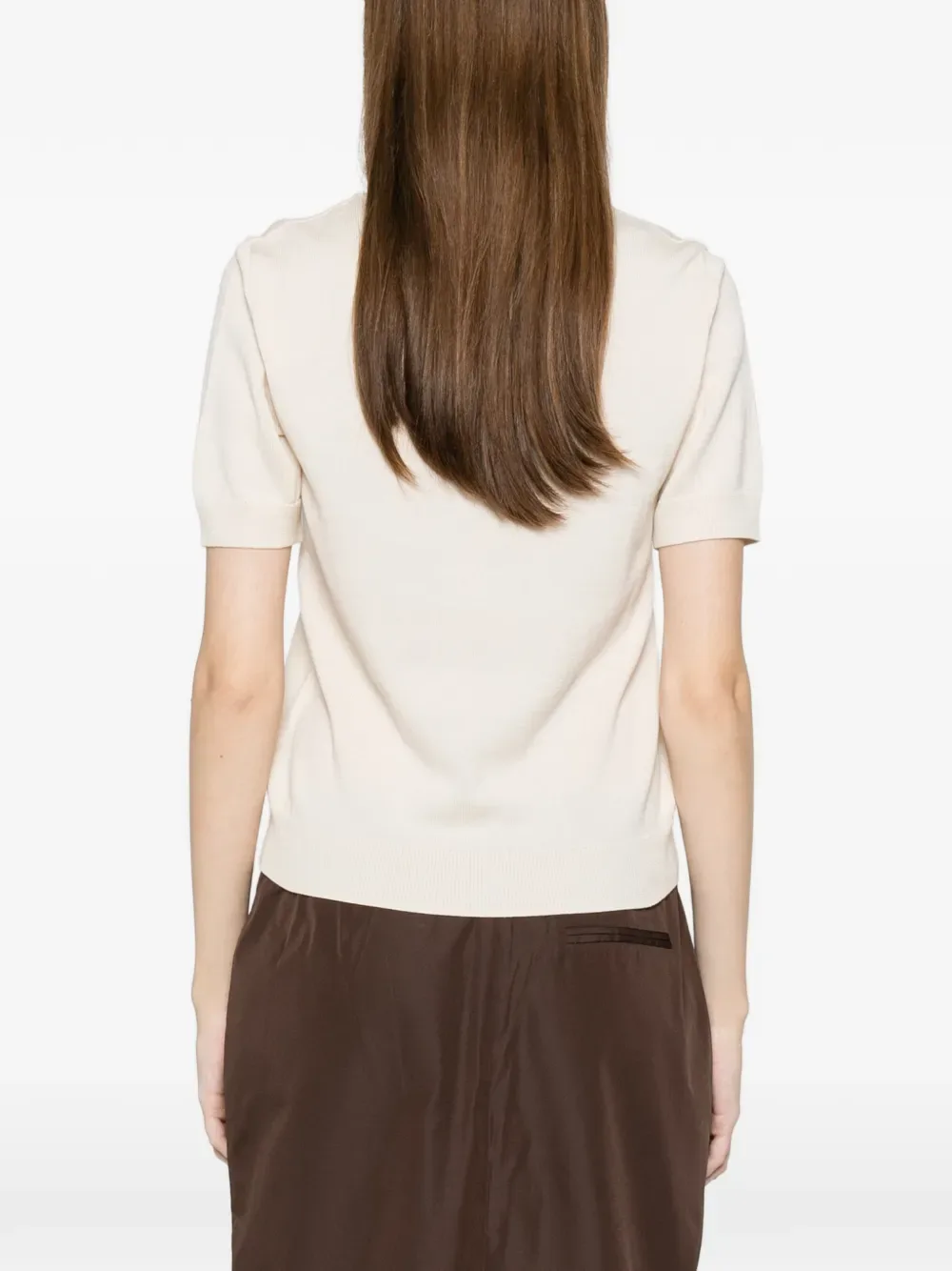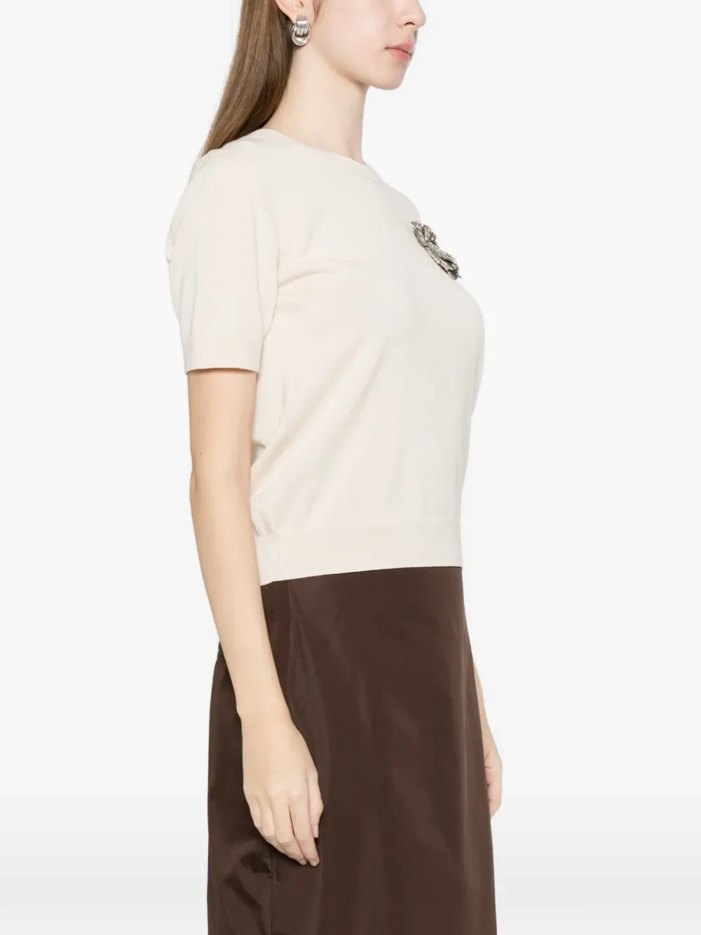 Кремовая кофта с брошью, короткими рукавами, круглым вырезом и ребристым подолом