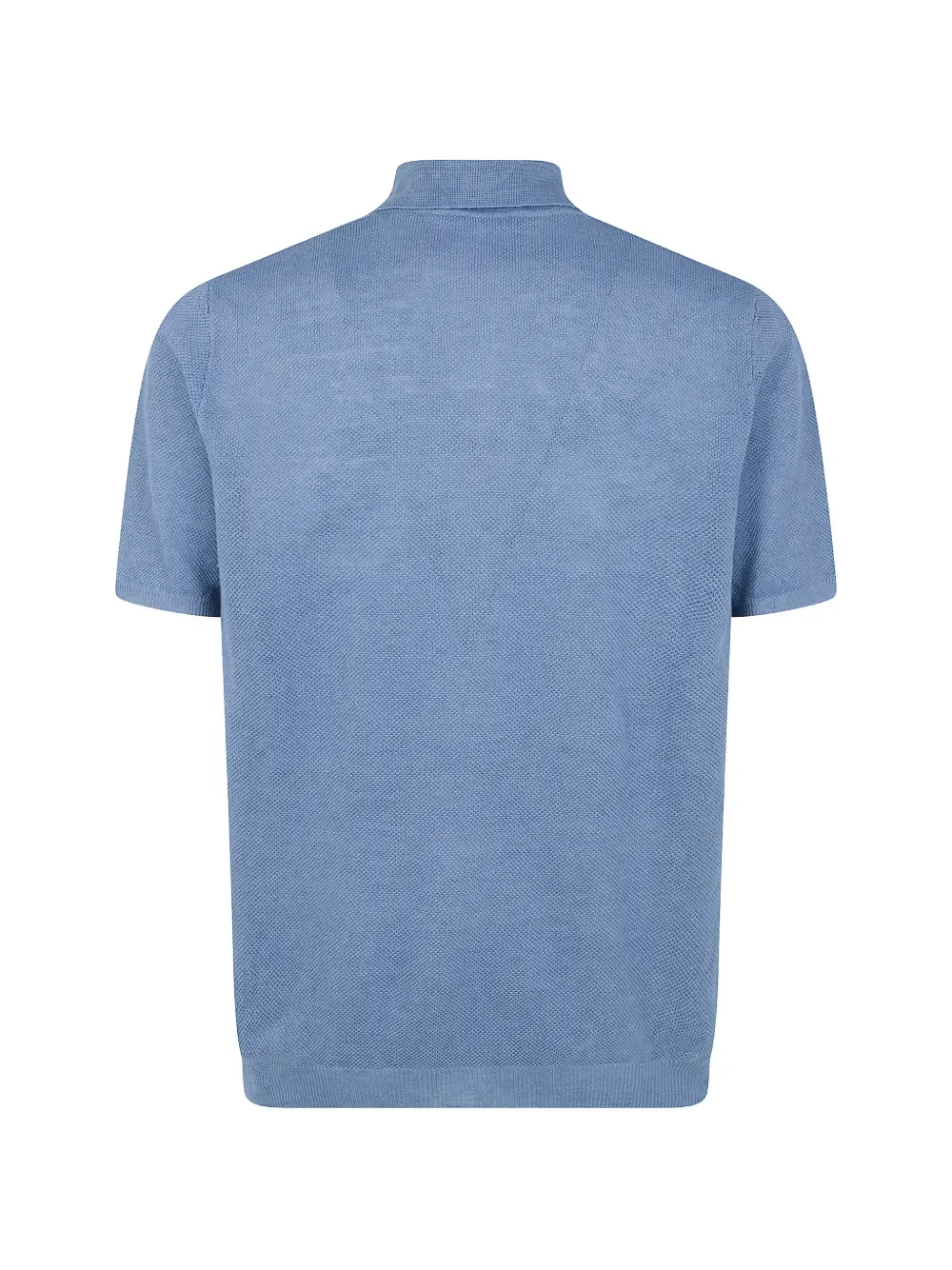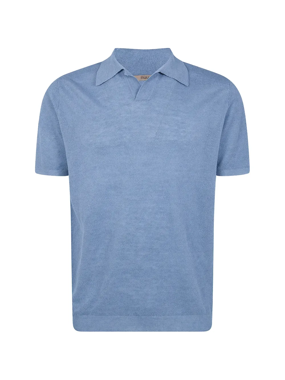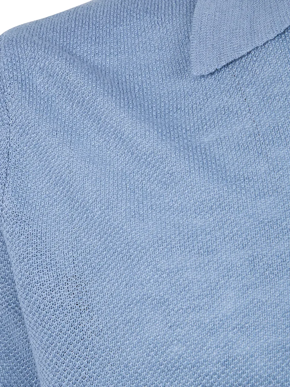 Небесно-голубой льняной трикотаж, короткие рукава, воротник-поло, ребристый низ