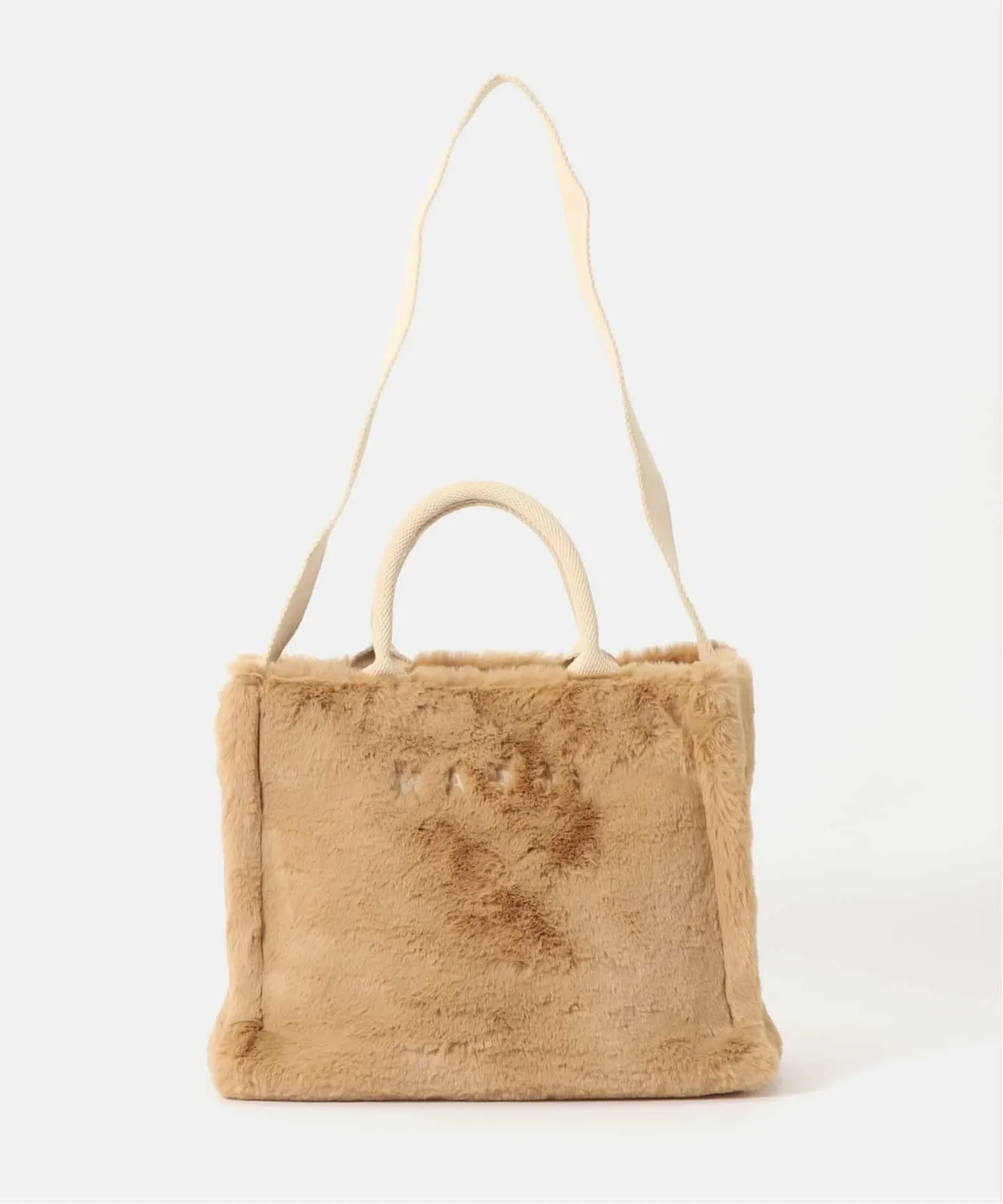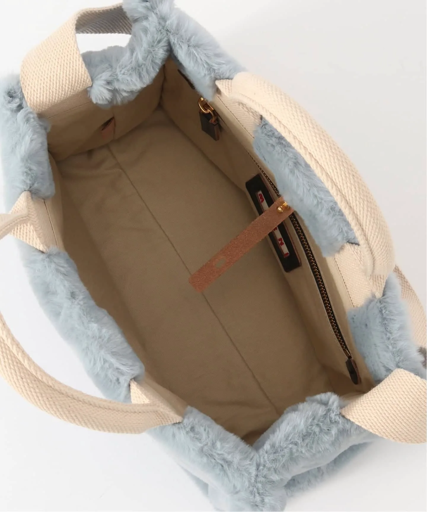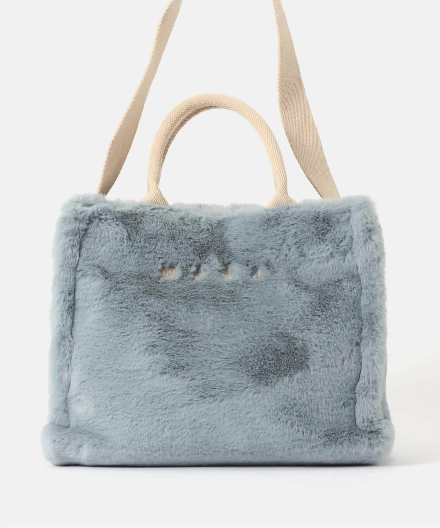Логотип MARNI — изюминка передней части, а верхняя ручка и плечевой ремень выполнены из ленты, которая отличается от самого меха, добавляя необходимую долю непринужденности.
