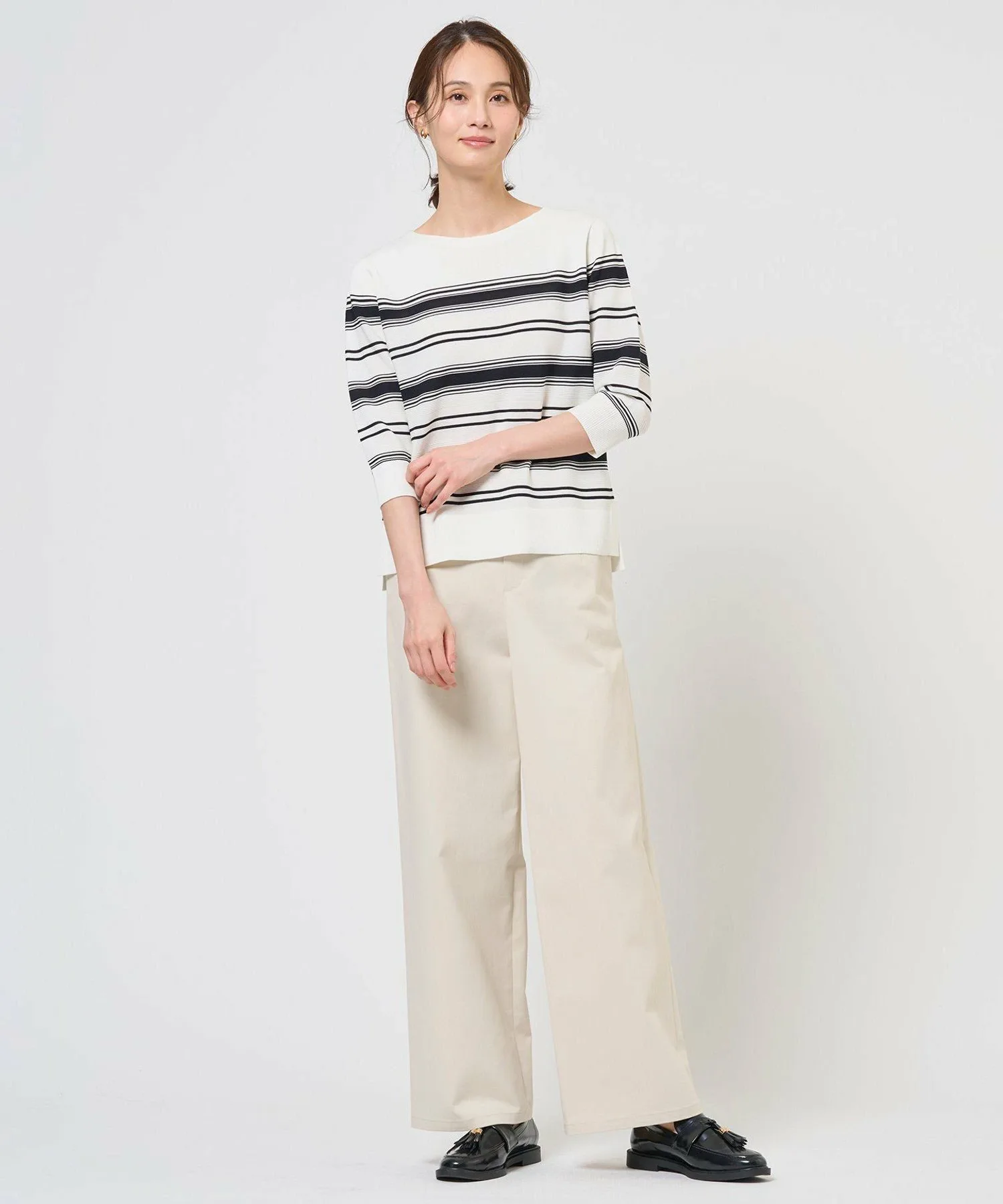 Дизайн: Этот трикотаж связан платочной вязкой и полосатыми петлями. Различные узоры на воротнике создают четкий силуэт вокруг шеи и аккуратный, опрятный вид. Основная часть связана платочной вязкой, создавая тонкую текстуру для прохладного и освежающего вида. Боковые разрезы и прямой силуэт делают эту универсальную вещь легко сочетаемой с юбками и брюками. Доступен в двух цветах: изысканный и теплый кремово-белый/верблюжий (#134) и освежающий и элегантный кремово-белый/темно-синий (#175).