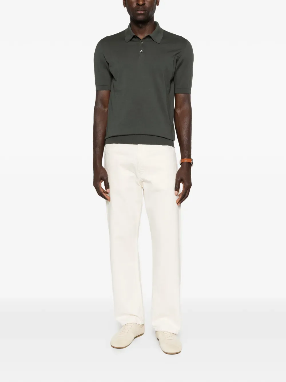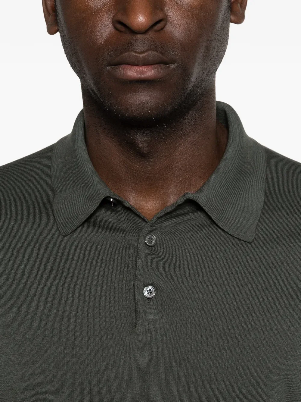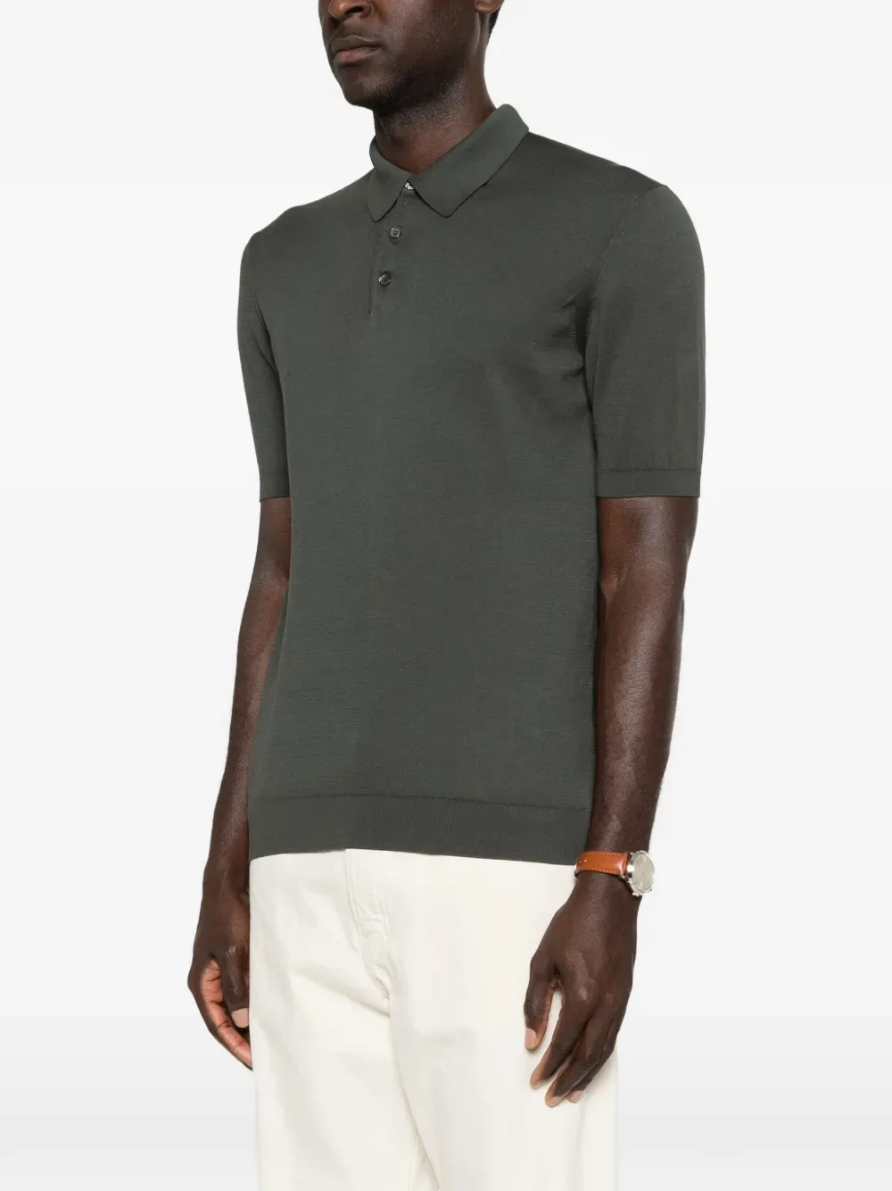 Зеленая футболка-поло с короткими рукавами, застежкой на пуговицы и воротником