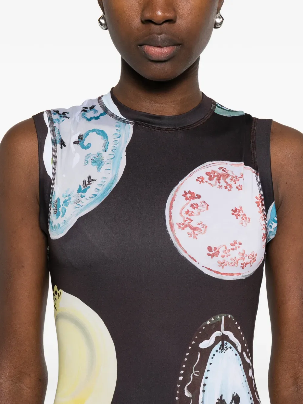 Коричневая майка без рукавов с принтом "тарелка" и круглым вырезом