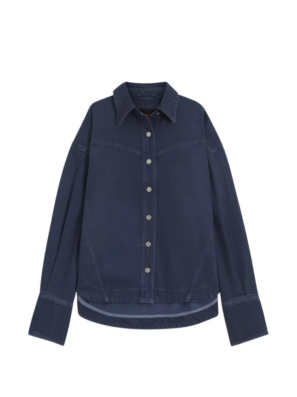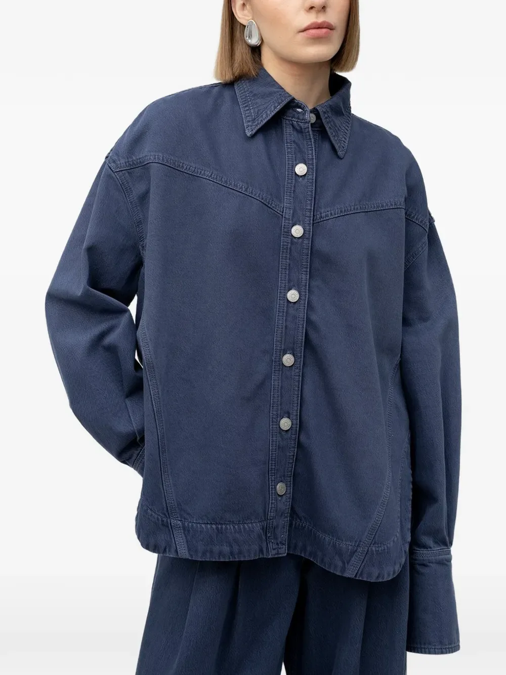 Синяя рубашка с застежкой на пуговицы, длинными рукавами, прострочкой и закругленным подолом