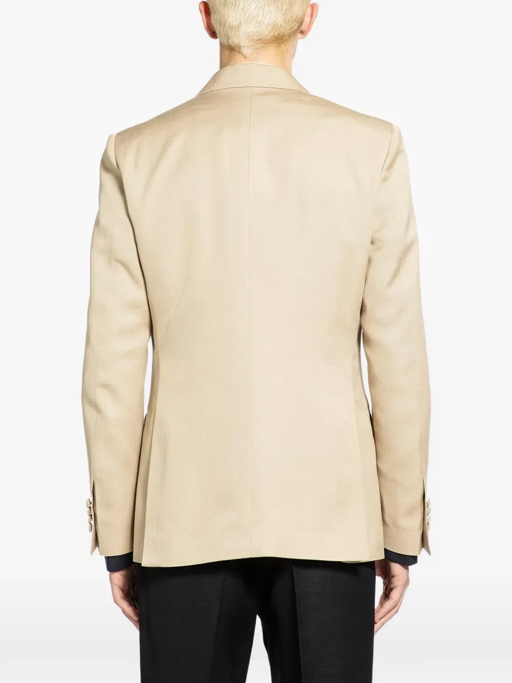 Бежевые заостренные лацканы, застежка на пуговицы, длинные рукава, карманы с клапанами, манжеты на пуговицах