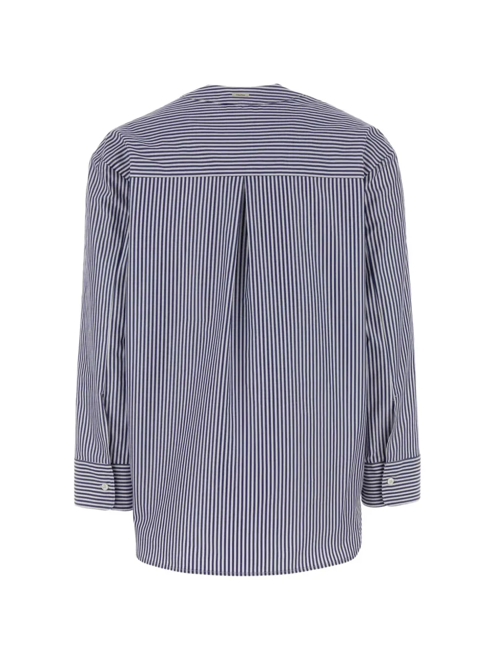 Голубая полосатая рубашка из поплина с вышивкой, V-образным вырезом, нагрудным карманом и манжетами на пуговицах