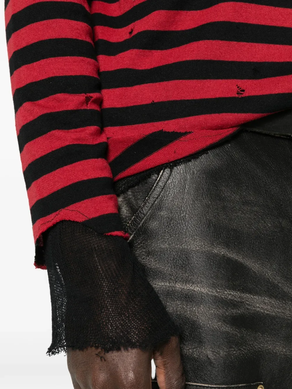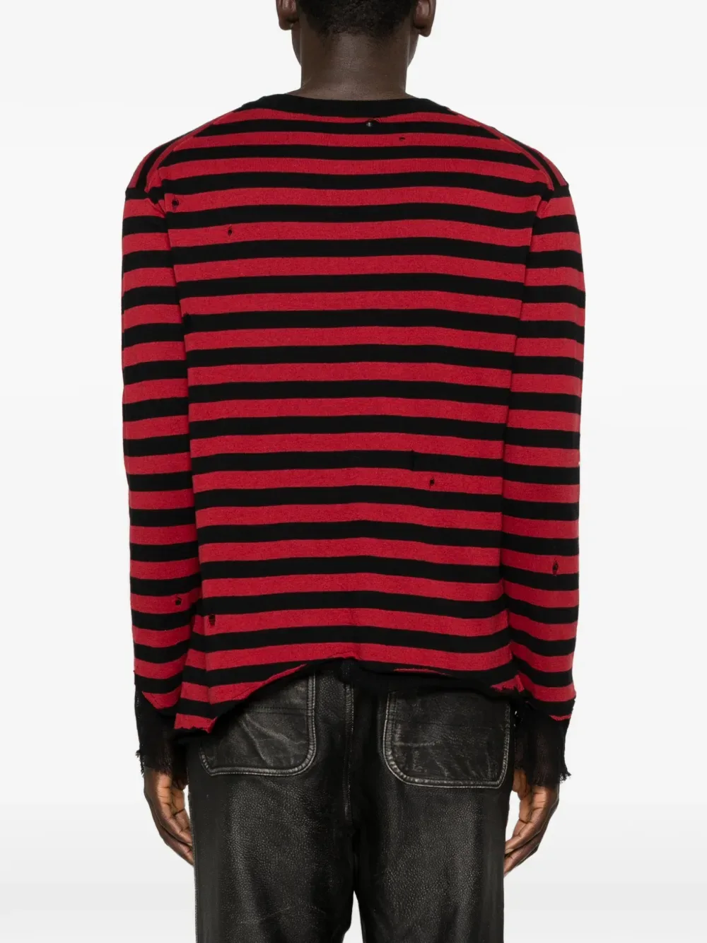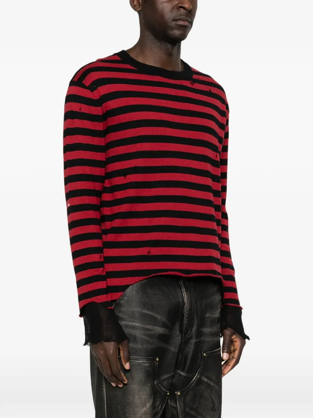 Красный в полоску, с необработанным краем, круглый вырез, длинные рукава