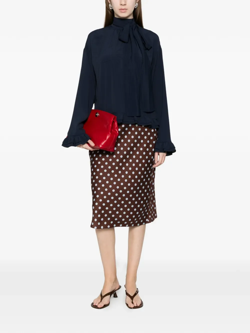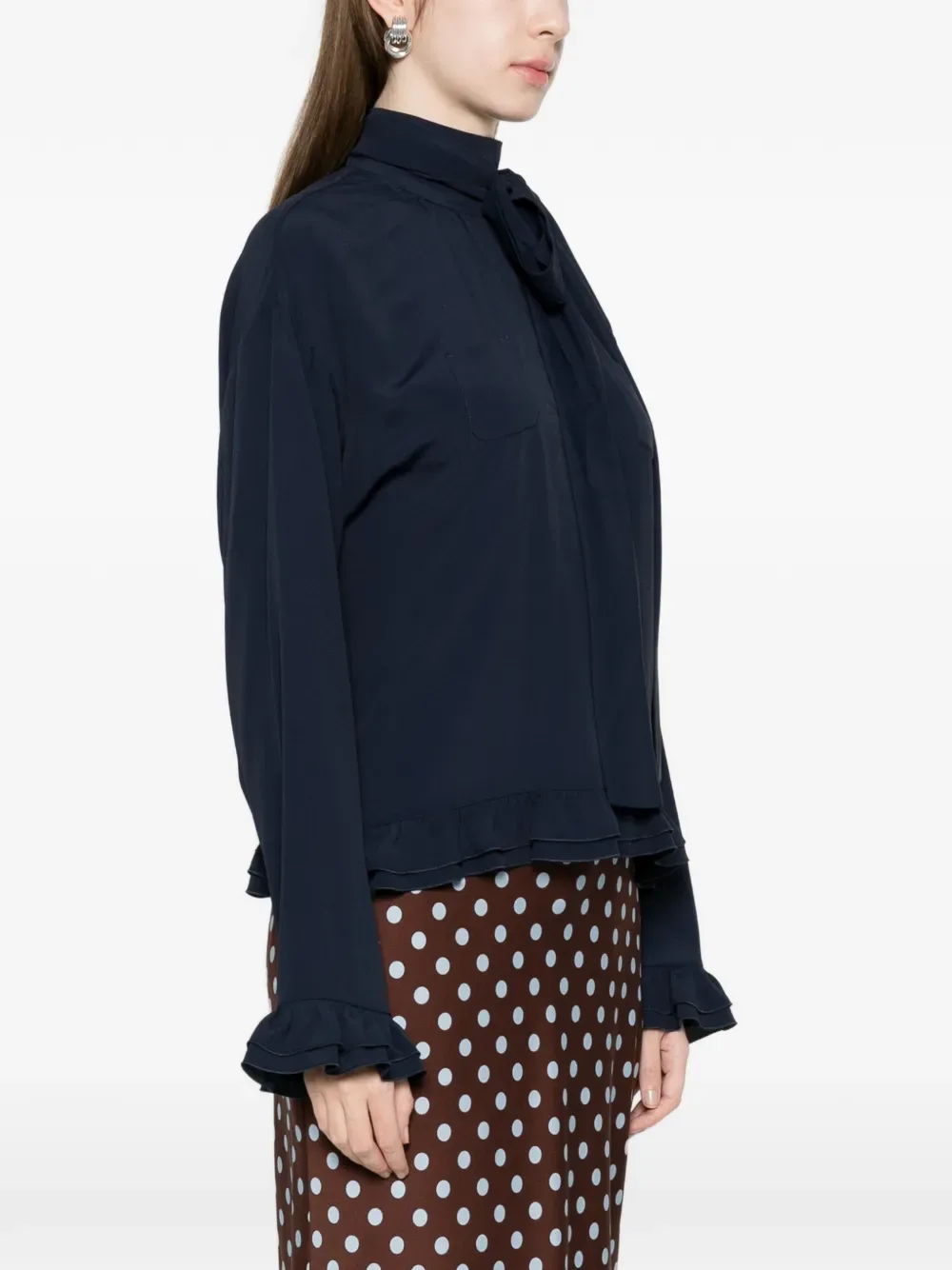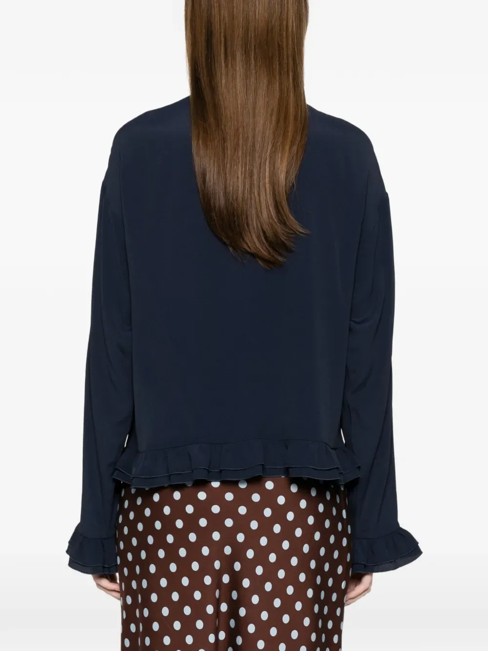 Синий топ с накладным карманом на груди, оборками и длинными рукавами