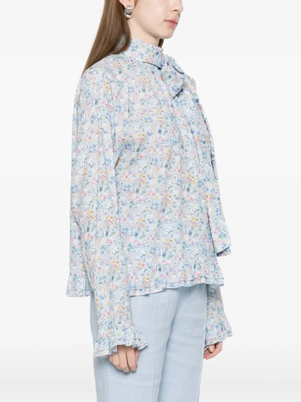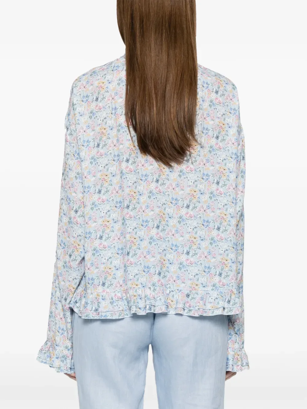 Голубая блуза с цветочным принтом, длинными рукавами, оборчатым подолом и манжетами