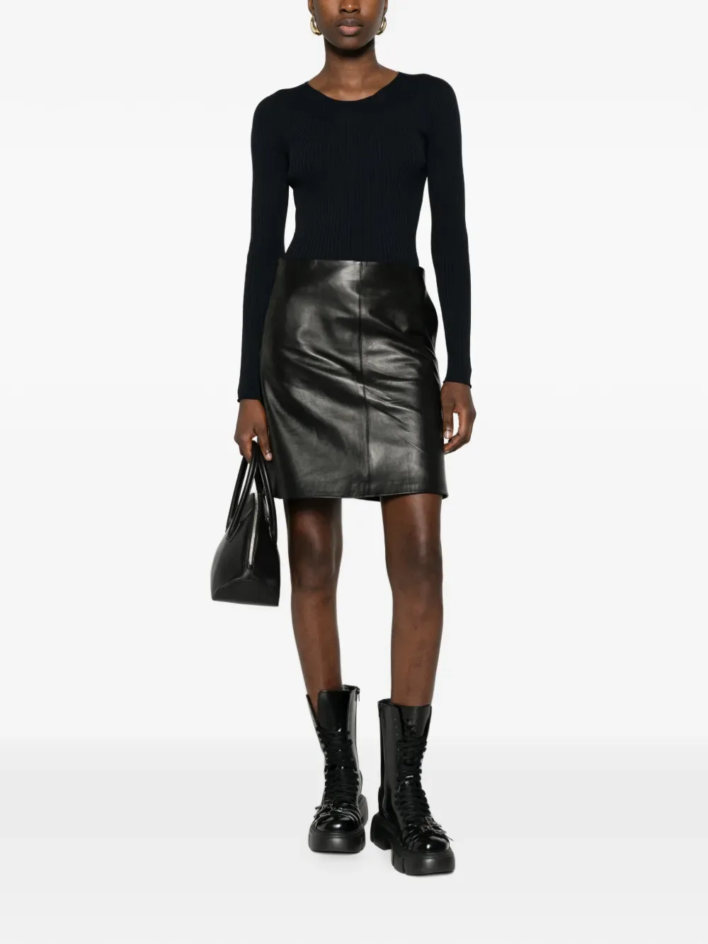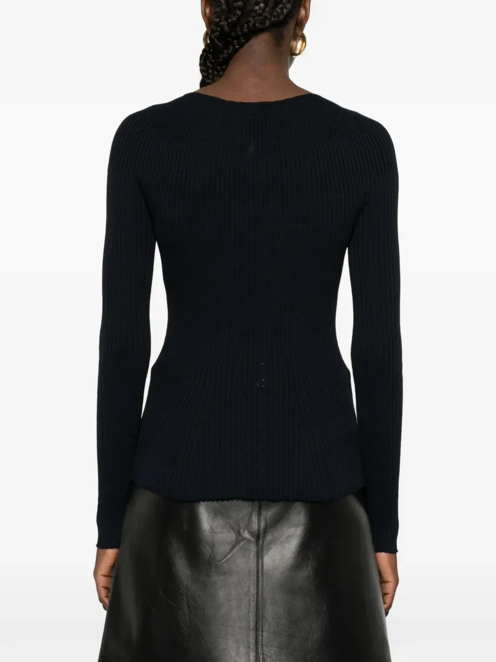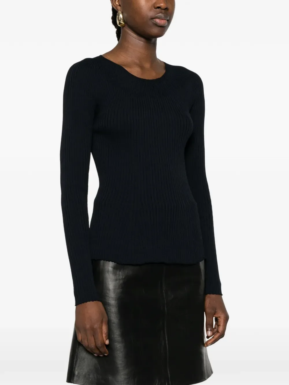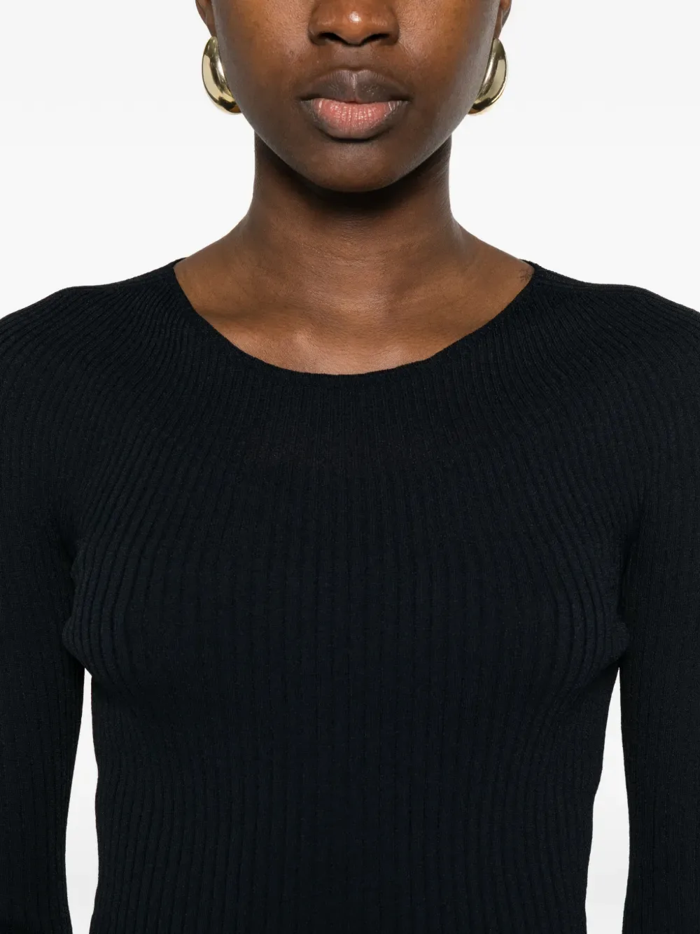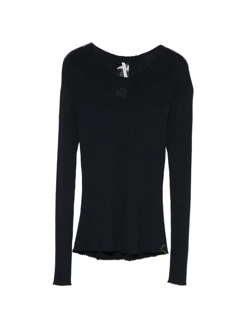 Ночной черный вязаный трикотаж с ребристой фактурой, круглый вырез, длинные рукава, волнистая отделка