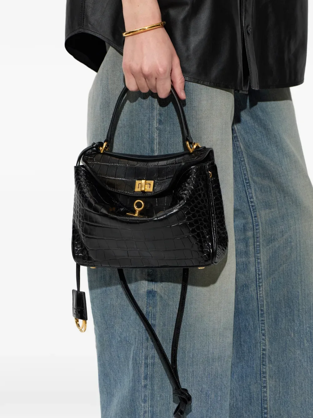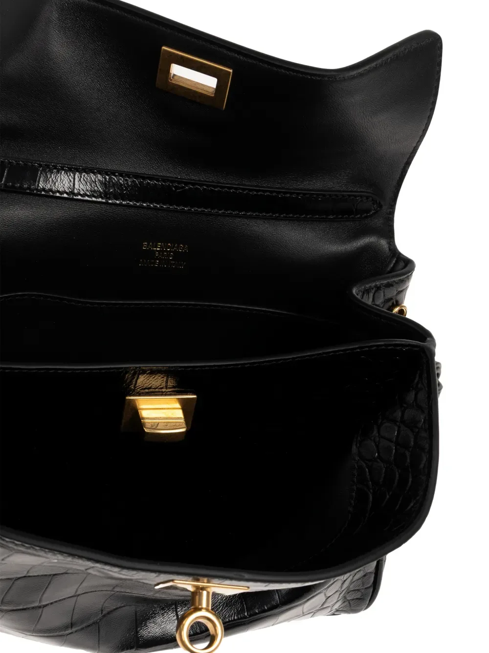 Черная сумка с верхней ручкой, съемным плечевым ремнем, застежкой-поворотным замком и фурнитурой золотистого оттенка