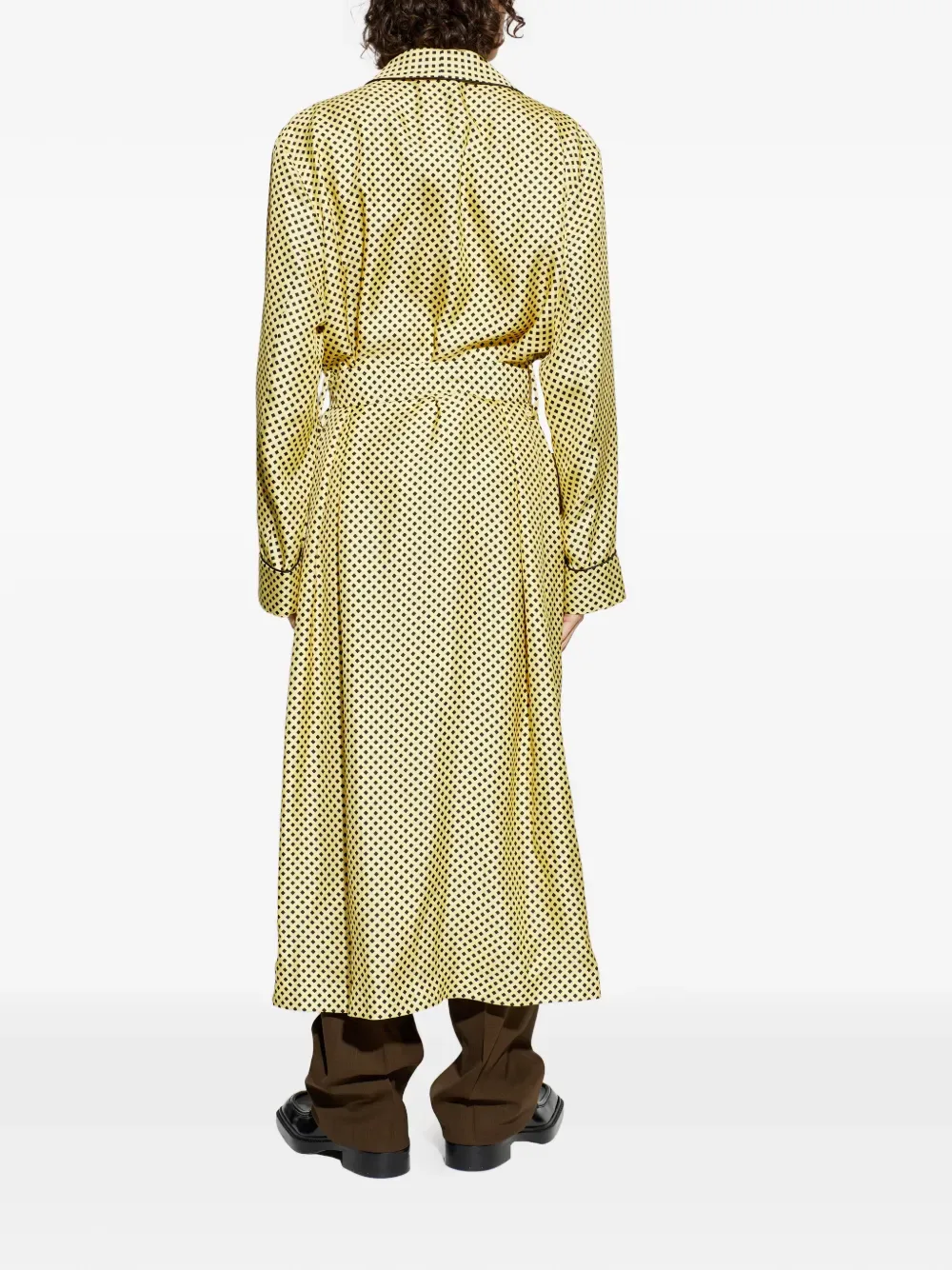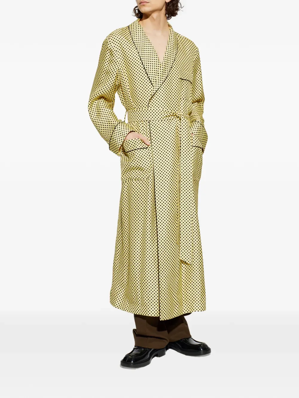 Желтый узор в горошек, окантовка, пояс, передние карманы, длинные рукава