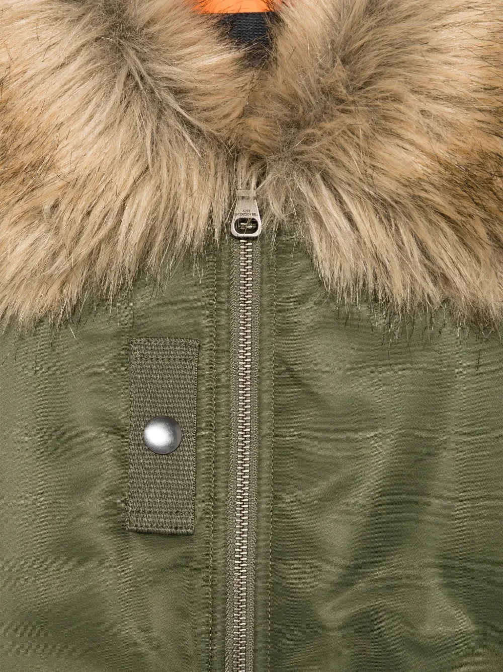Зеленая отделка из меха, застежка-молния спереди, ребристый край, ребристые манжеты, нашивка