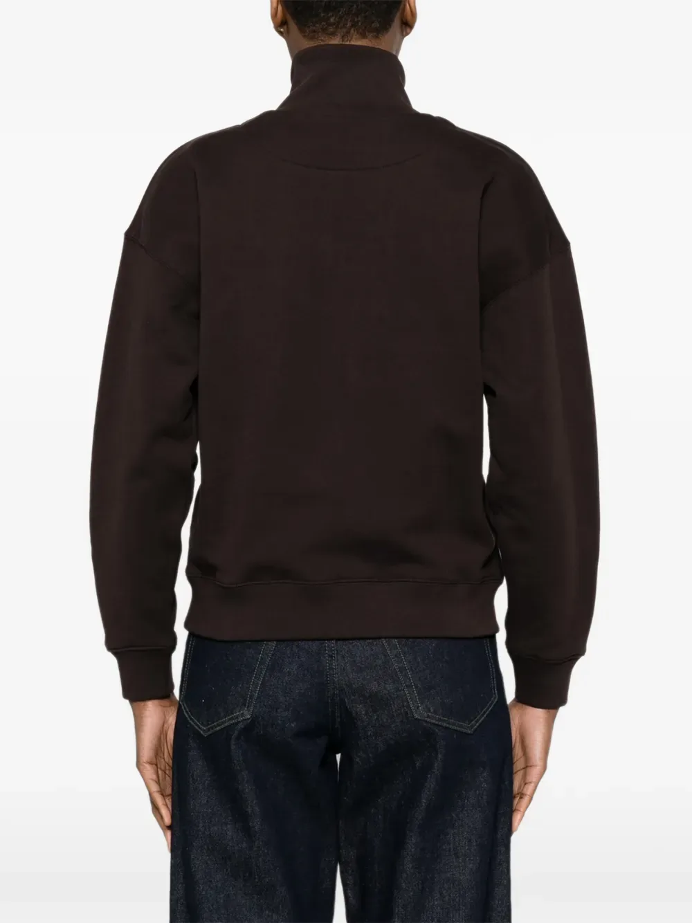 Коричневый, фурнитура серебристого тона, нашивка с логотипом, застежка на половину молнии, длинные рукава