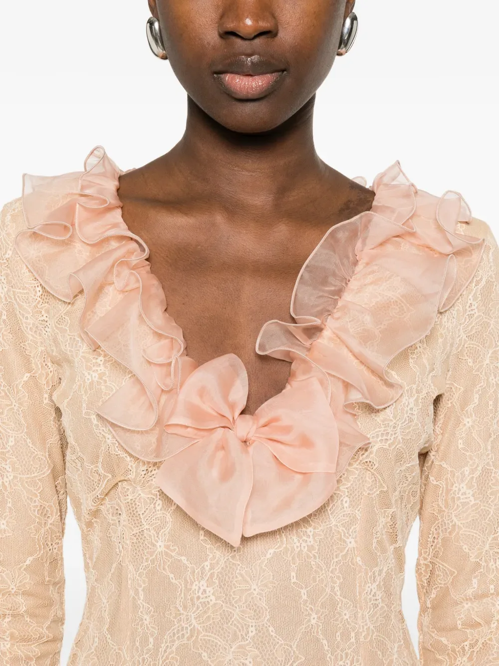 Нейтральный оттенок, отделка оборками, длинные рукава, скрытая застежка-молния
