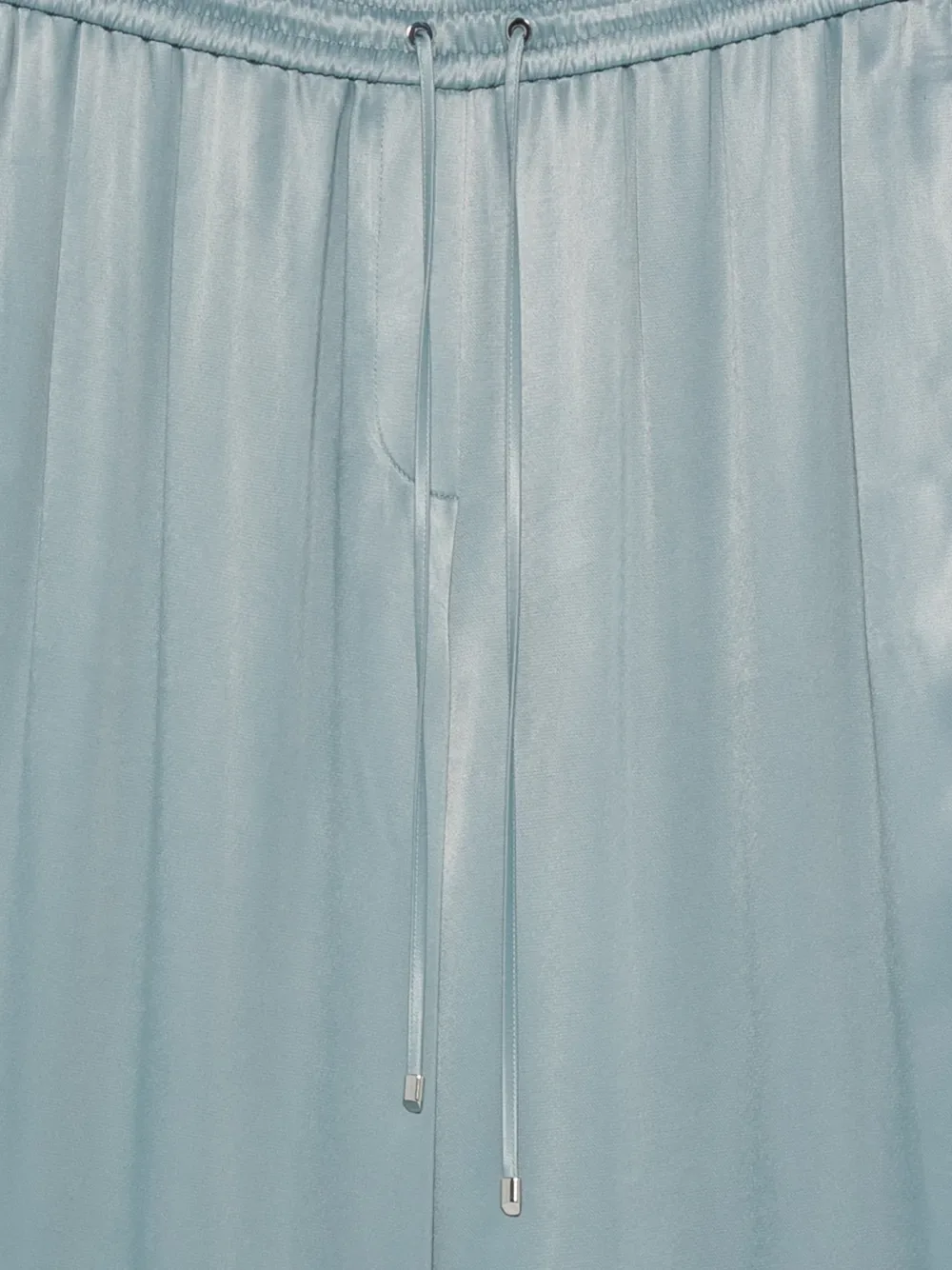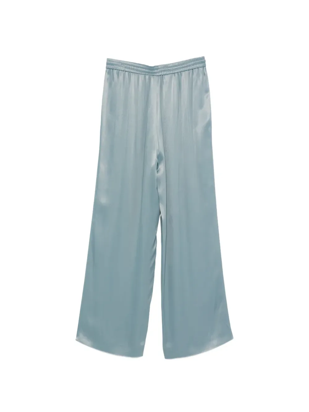 Синие брюки с завязками на талии, широкими штанинами и боковыми карманами в швах
