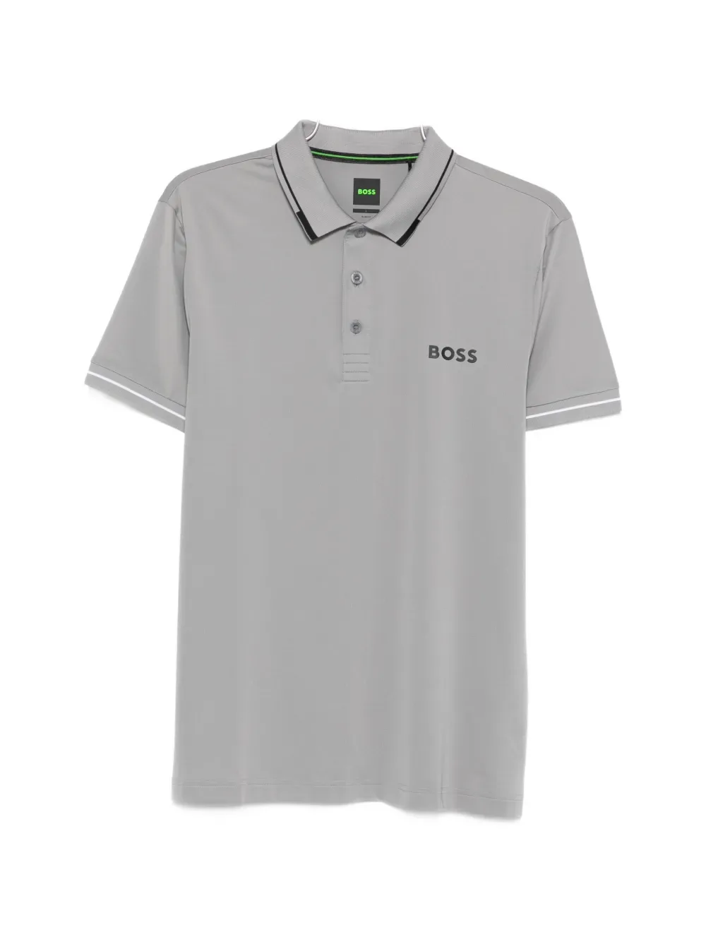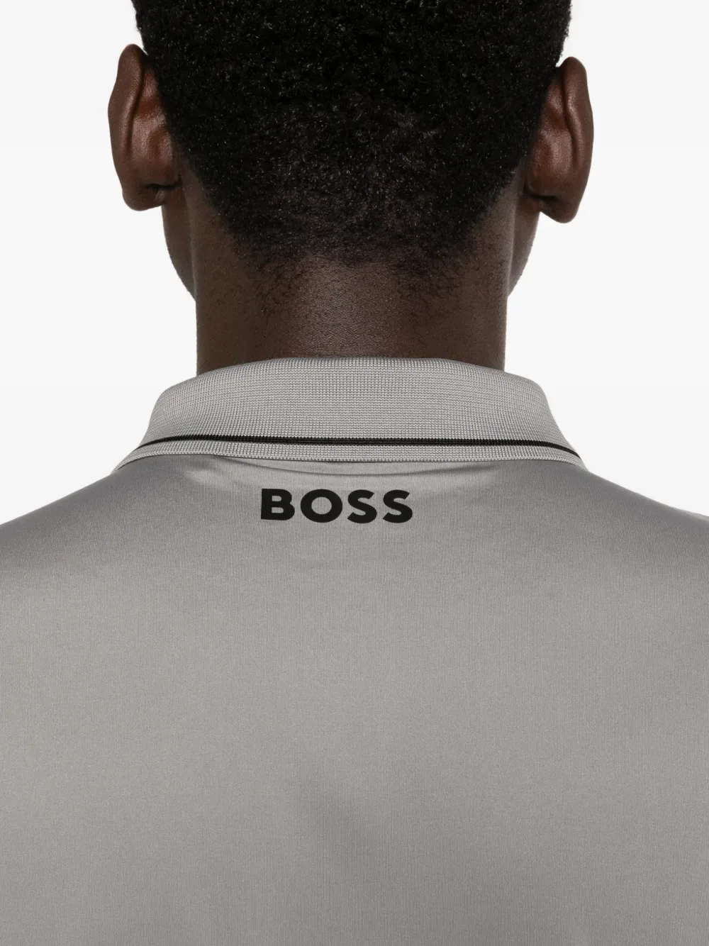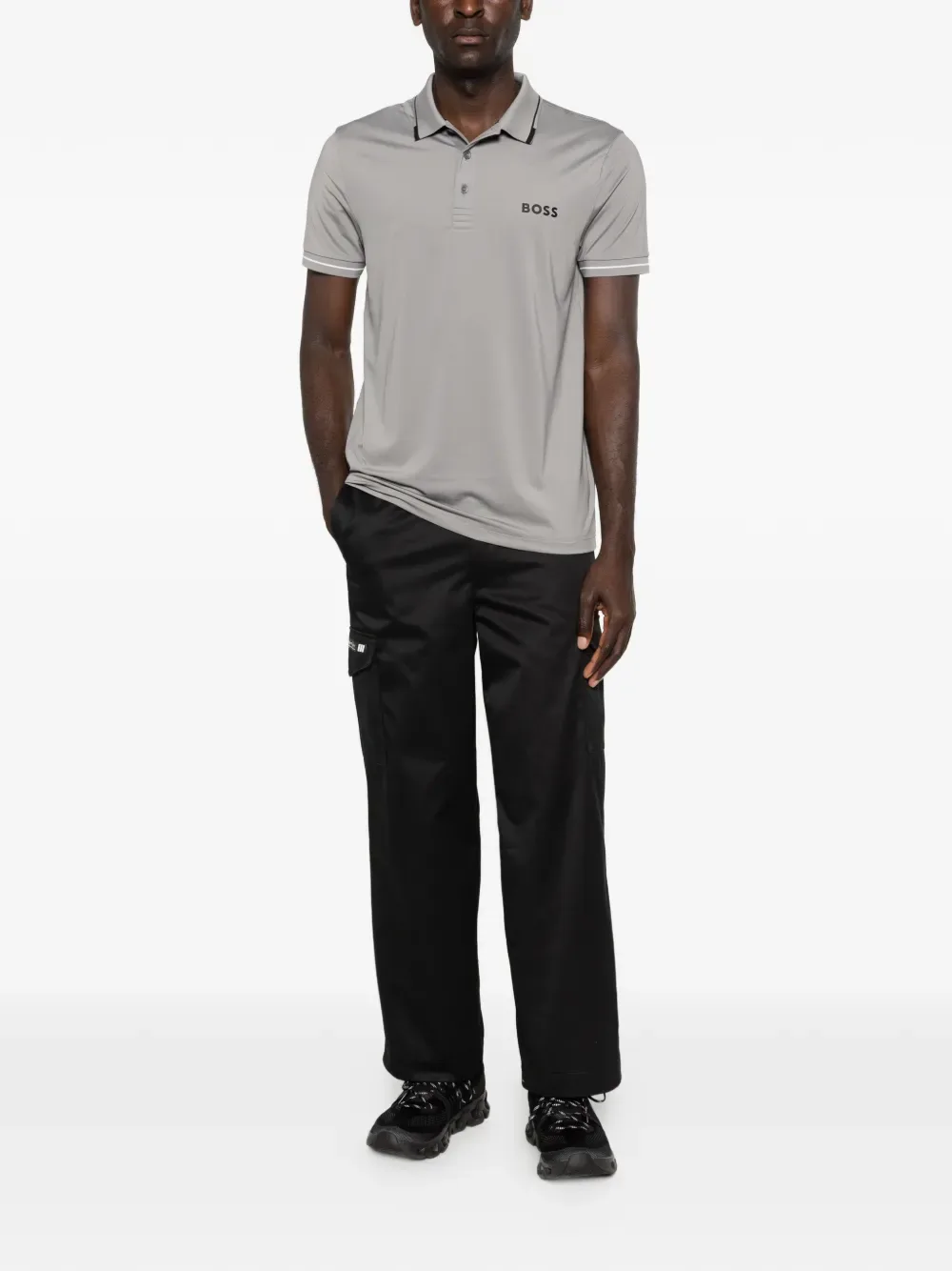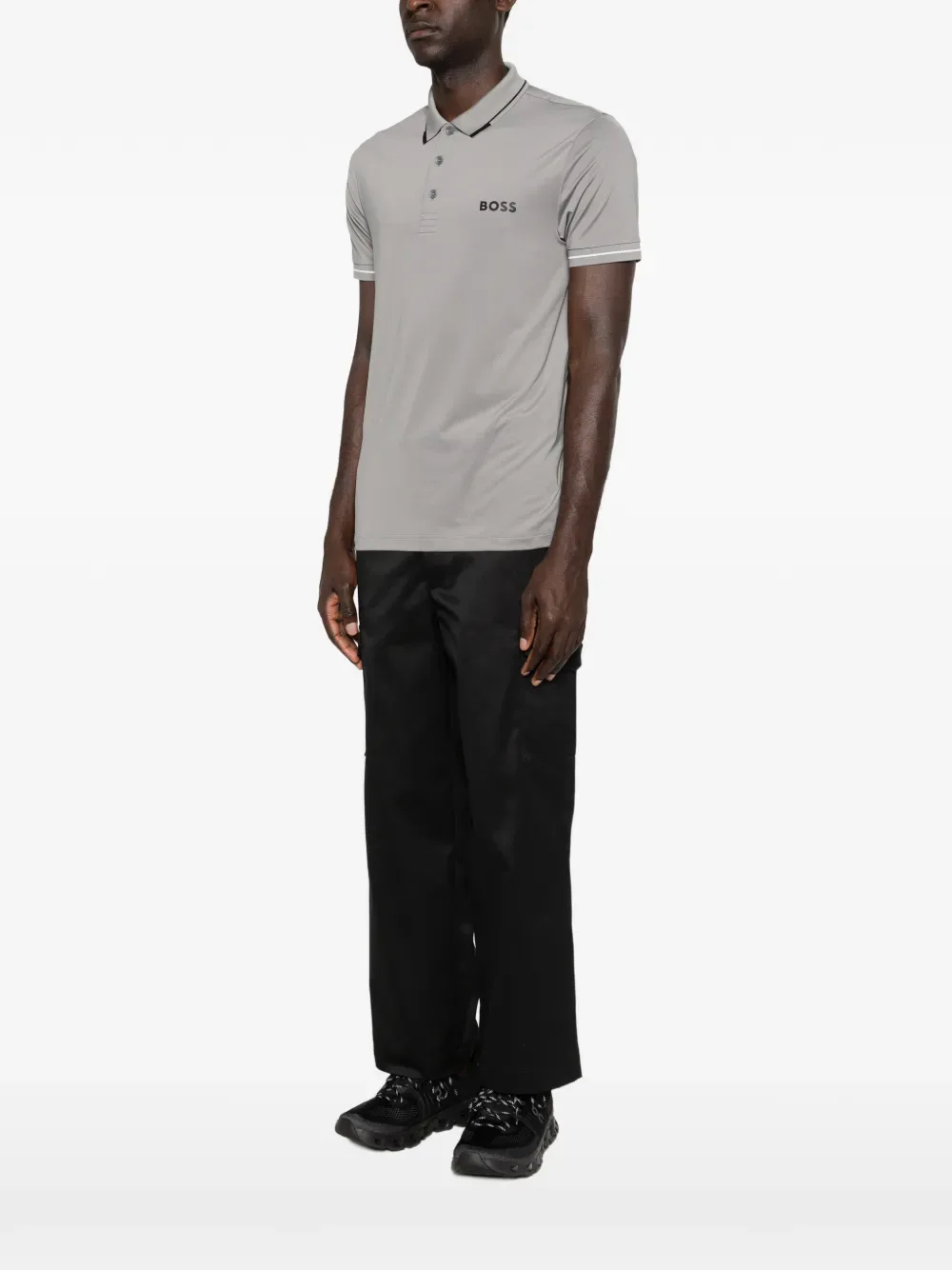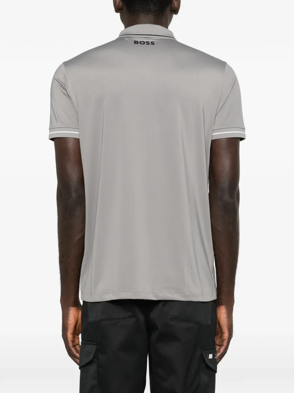 Серый с полосатыми деталями, короткие рукава, застежка на пуговицы, логотип