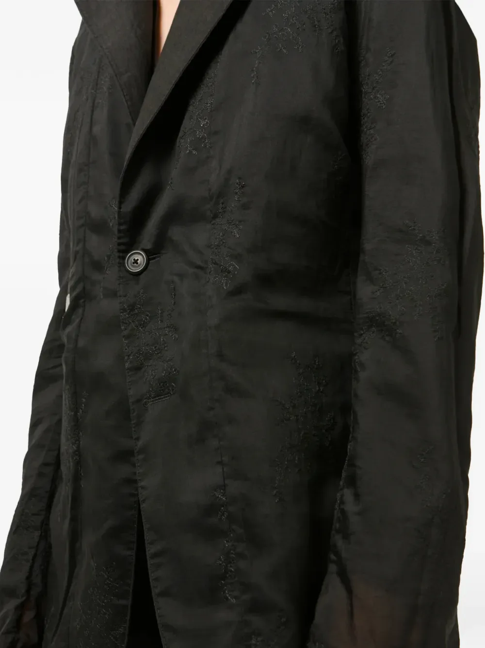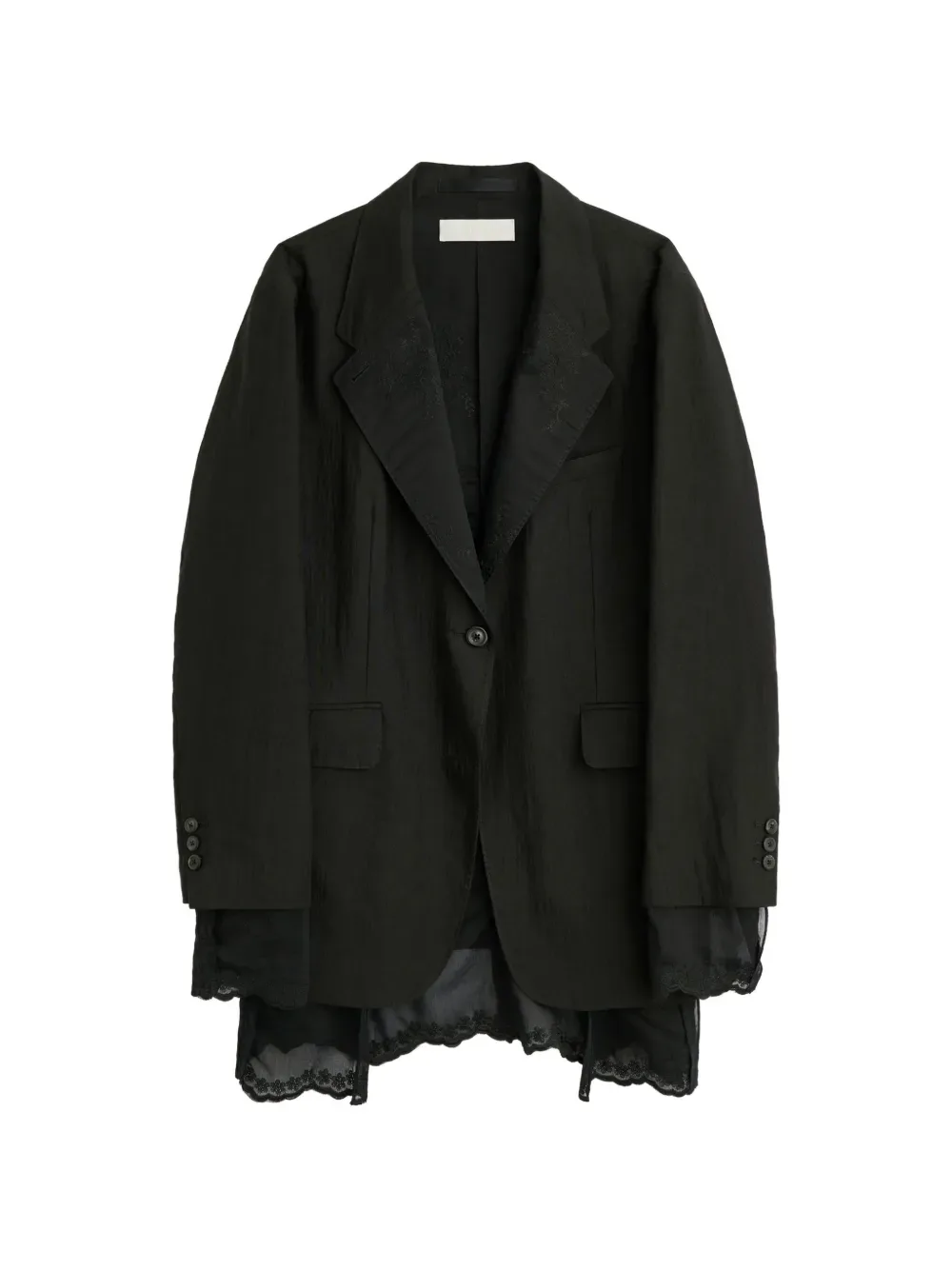 Черный однобортный пиджак, застежка на пуговицы, два накладных кармана спереди, длинные рукава