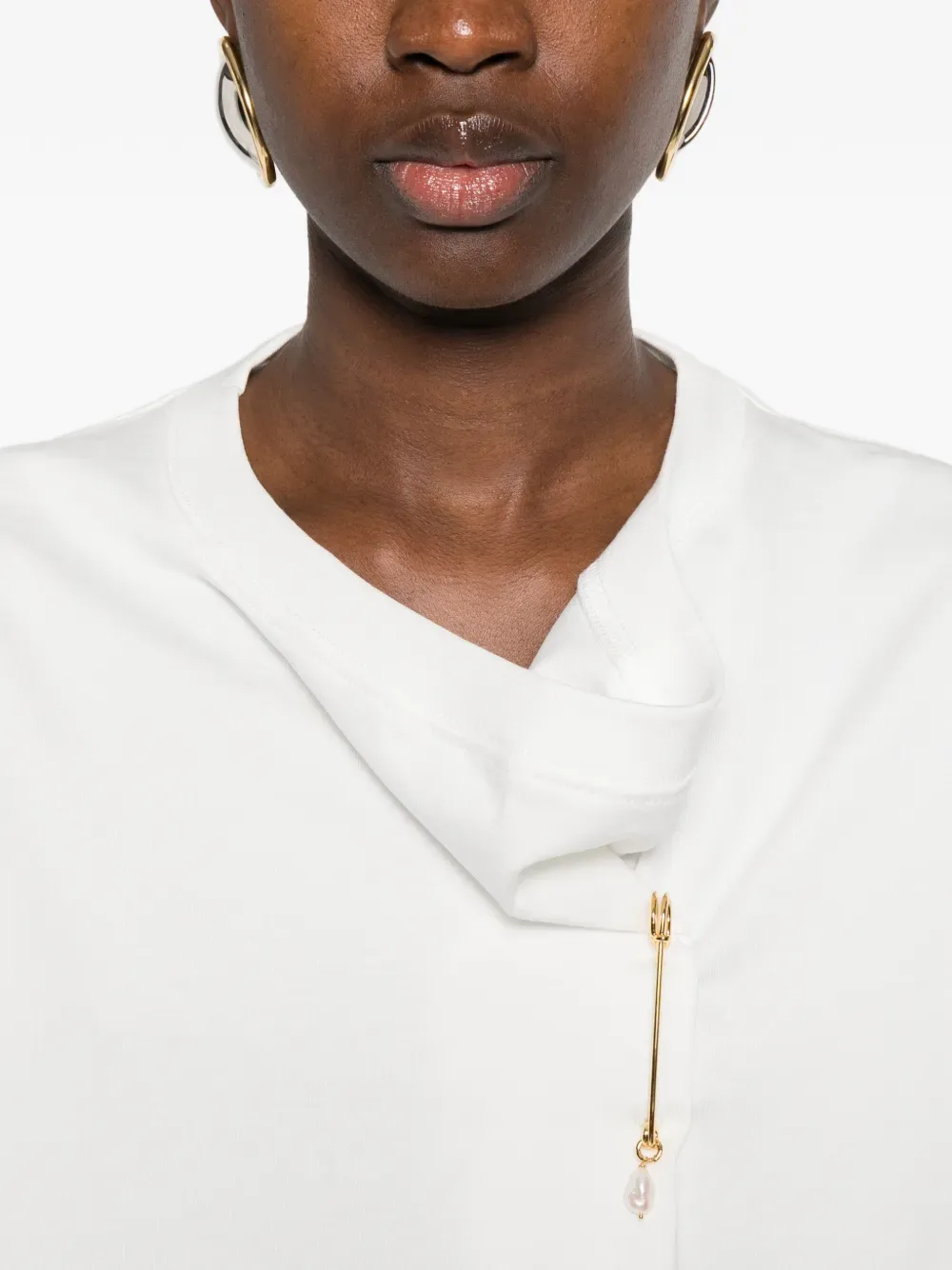 Белое платье с драпировкой, декоративной булавкой, рукавами до локтя и асимметричным вырезом