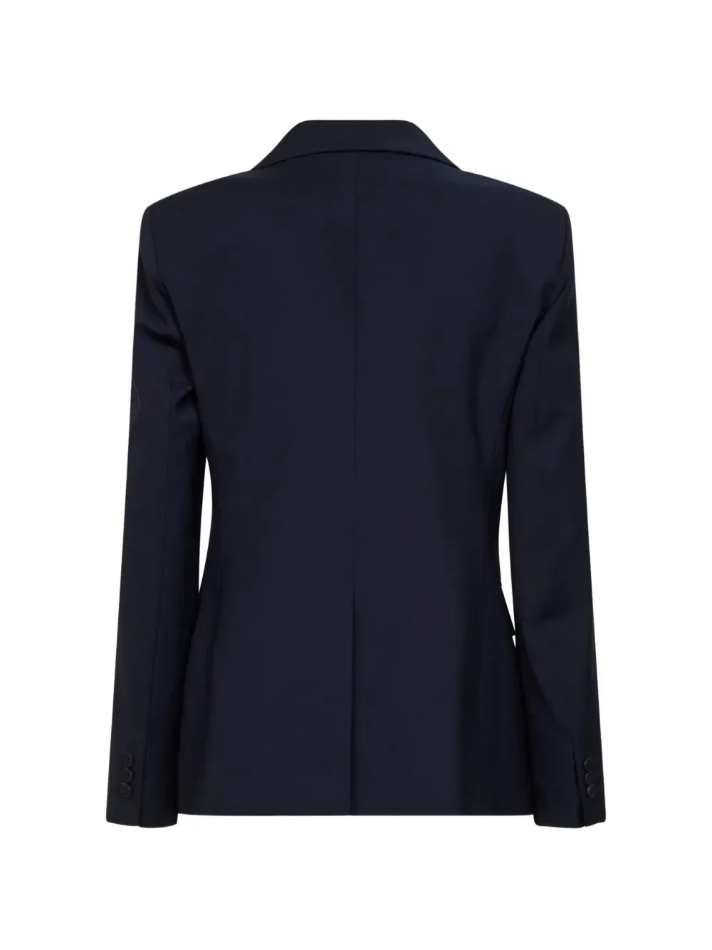 Темно-синий цвет, воротник с лацканами, прорезные карманы с клапанами, манжеты на три пуговицы, центральный разрез сзади