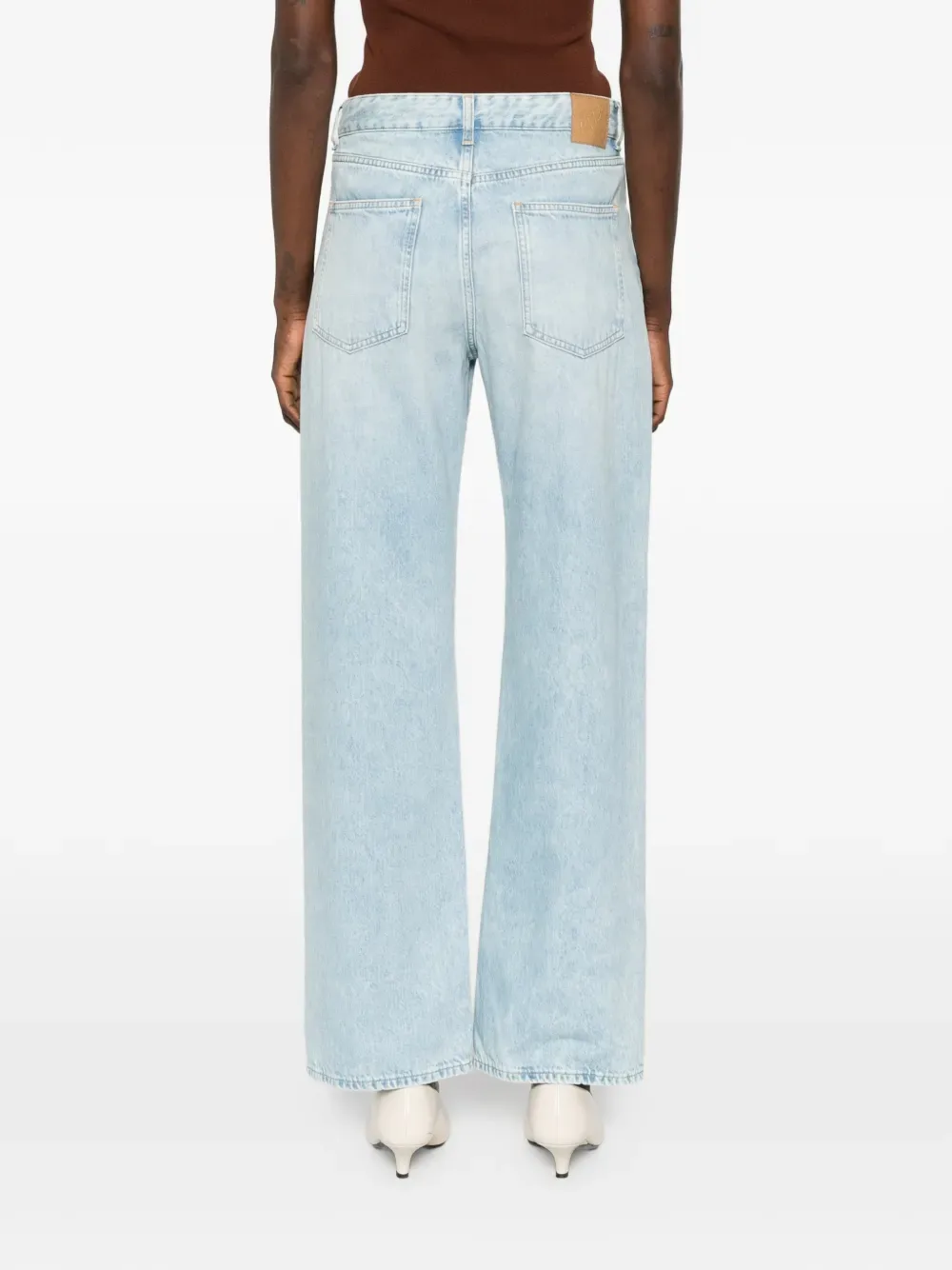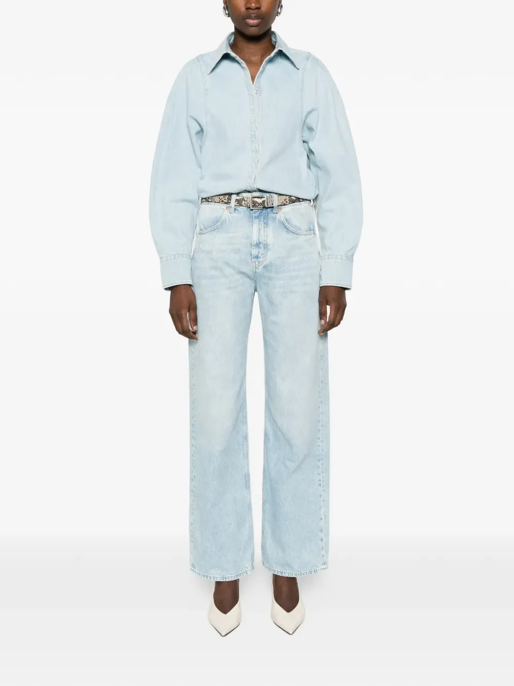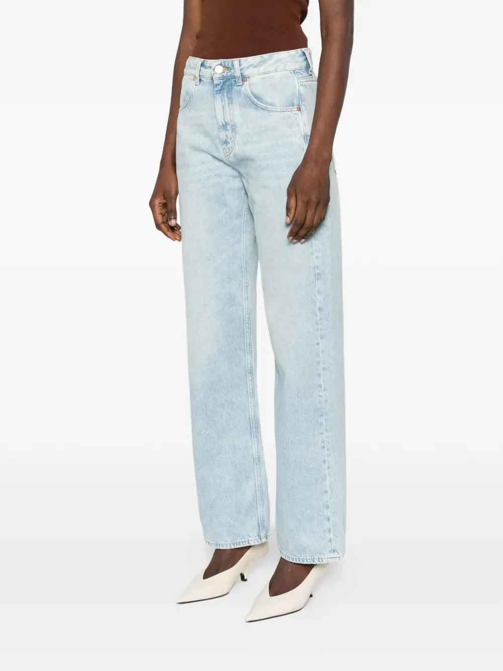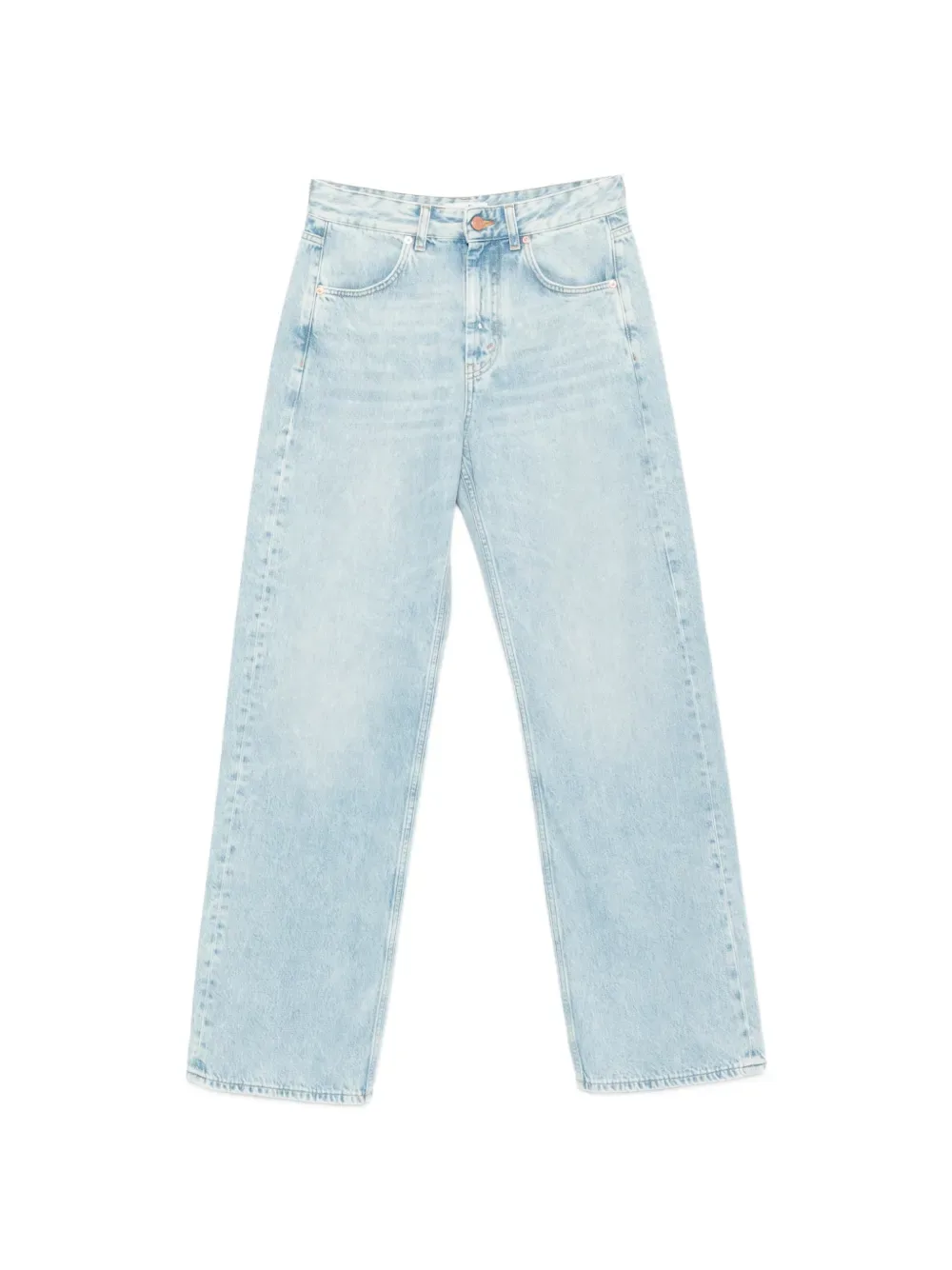 Светло-голубые, пять карманов, шлевки для ремня, застежка на пуговицу, прямые брючины