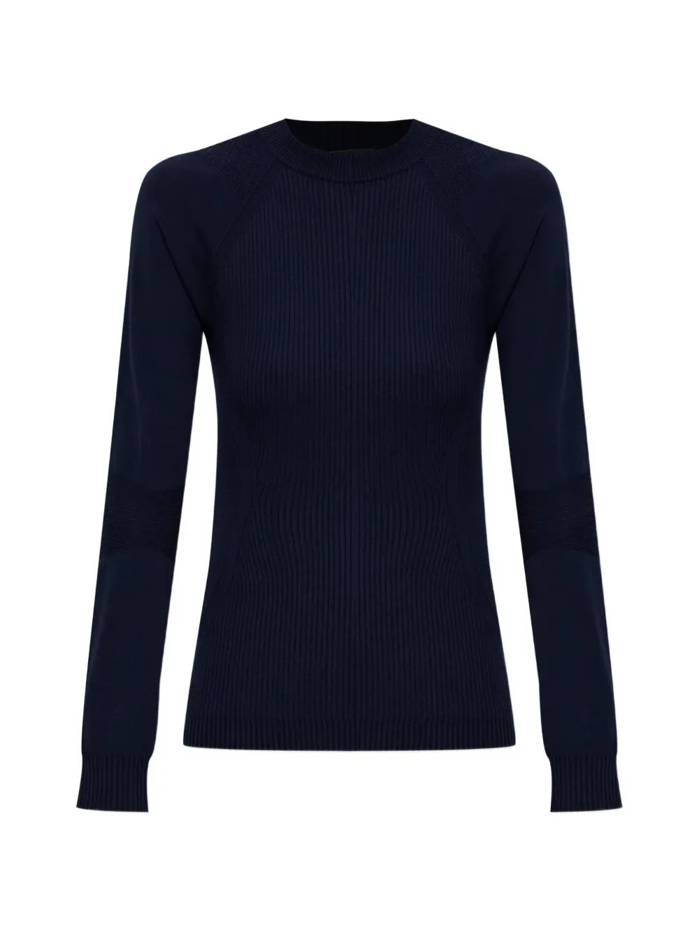 Темно-синий в рубчик, с нашивкой-логотипом, круглый вырез, длинные рукава, приталенный