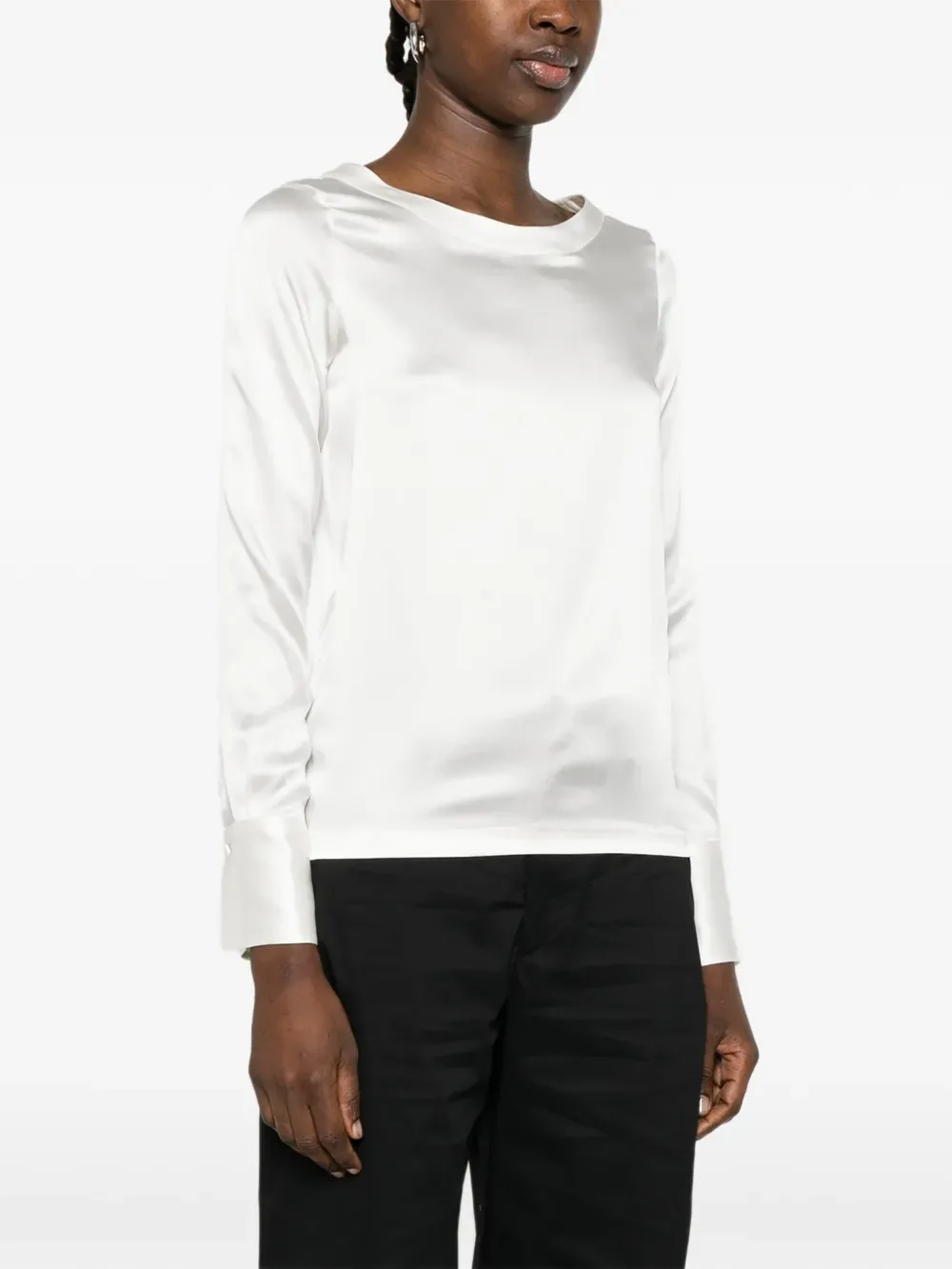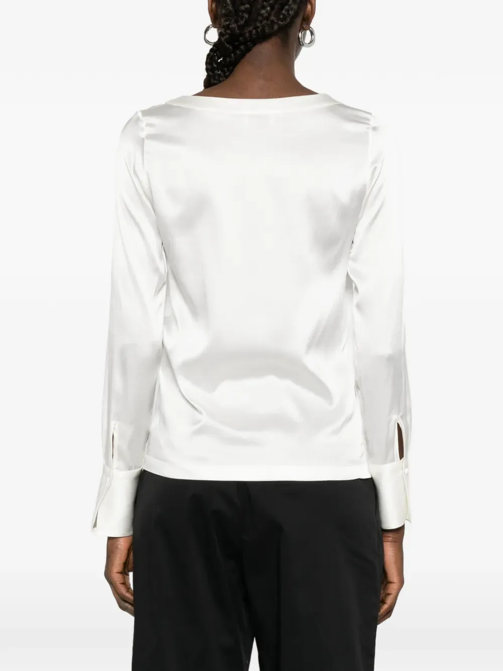 Белые манжеты на пуговицах, вырез лодочкой, длинные рукава, прямой низ