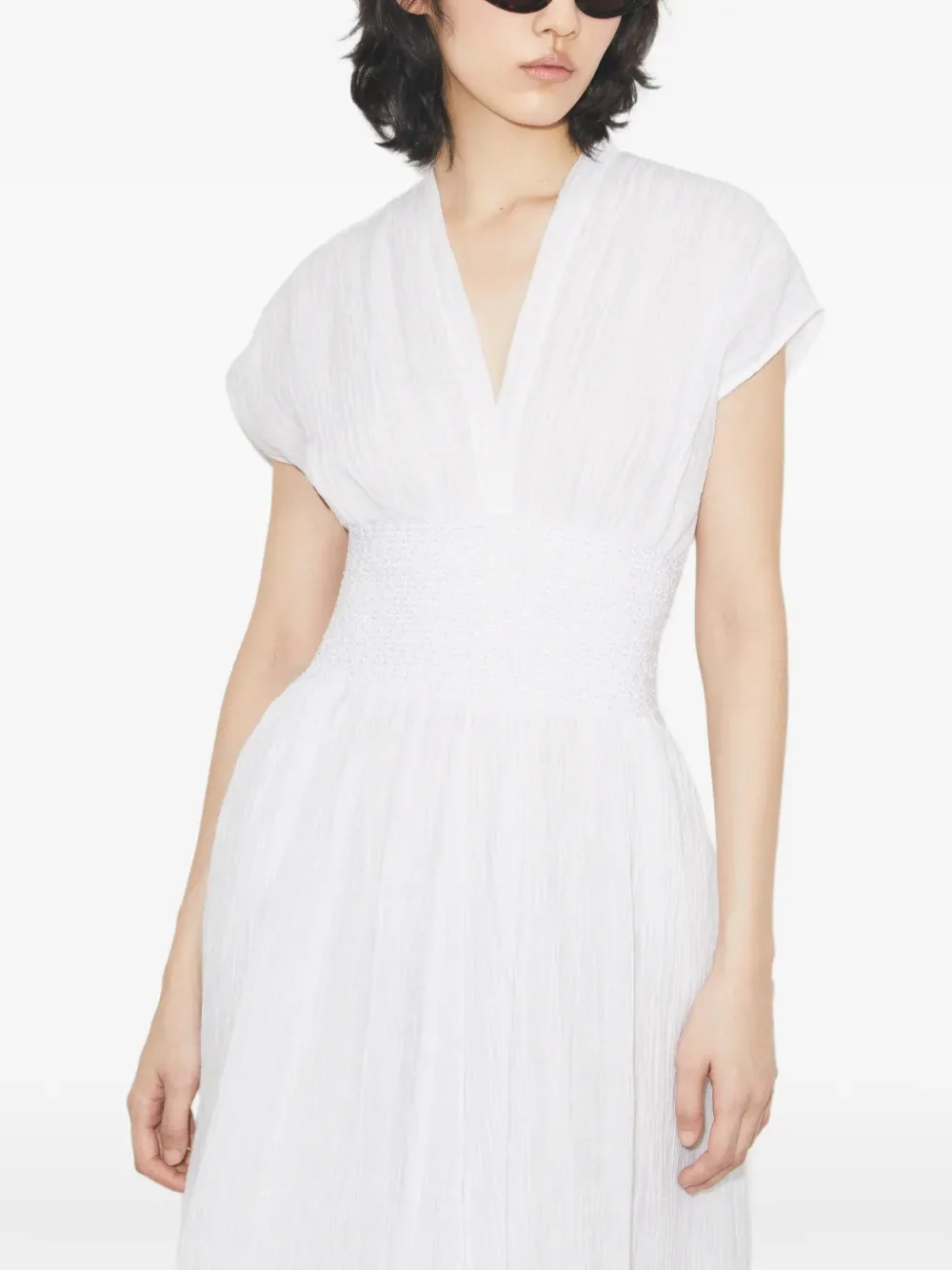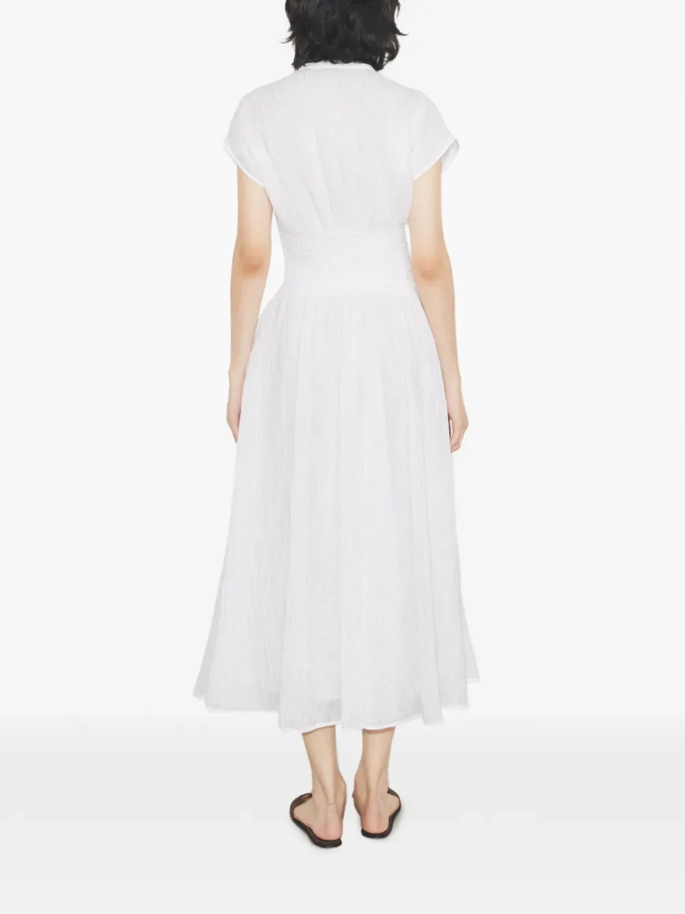 Сшитое из легкой смеси льна и хлопка, это платье миди длины выполнено в силуэте "фит энд флэр" с V-образным вырезом и присборенной талией. Необходимая вещь для теплой погоды, которую можно носить как накидку на купальник или как повседневное платье. Скрытая молния сзади с застежкой на крючок и петлю, карманы в боковых швах, эластичная вставка на талии. Длина: 127 см (размер XS). Накидки, белое, короткие рукава, присборенная талия.