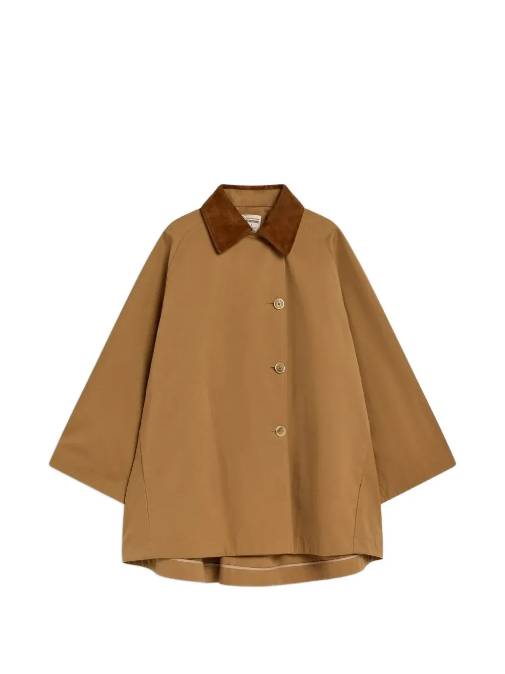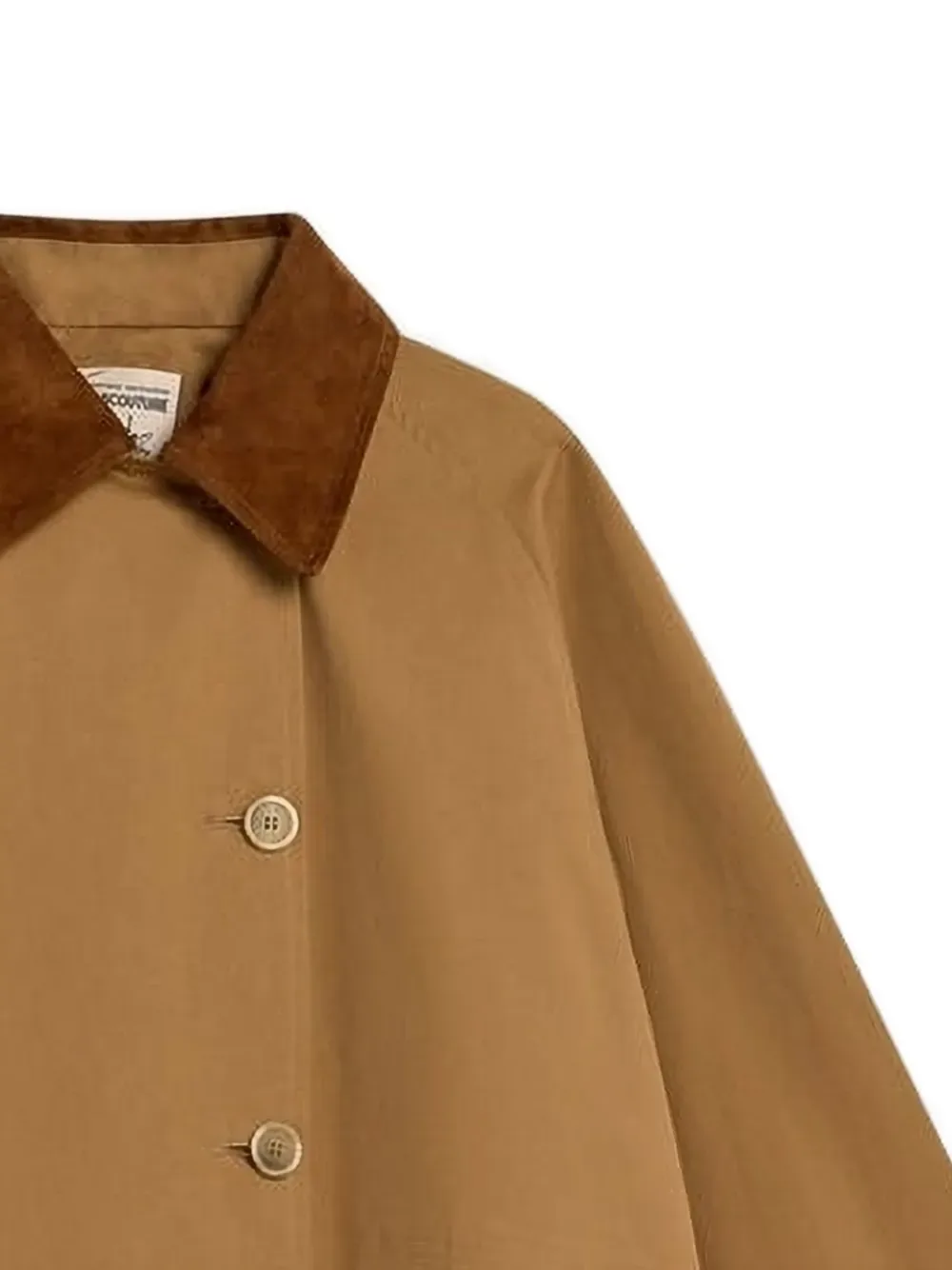 Светло-коричневый вельветовый воротник, застежка на пуговицы, длинные рукава, изогнутый подол сзади