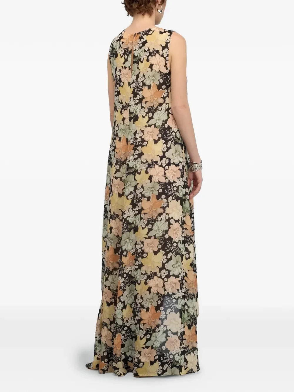 Черное платье без рукавов с цветочным принтом, круглым вырезом и асимметричным подолом