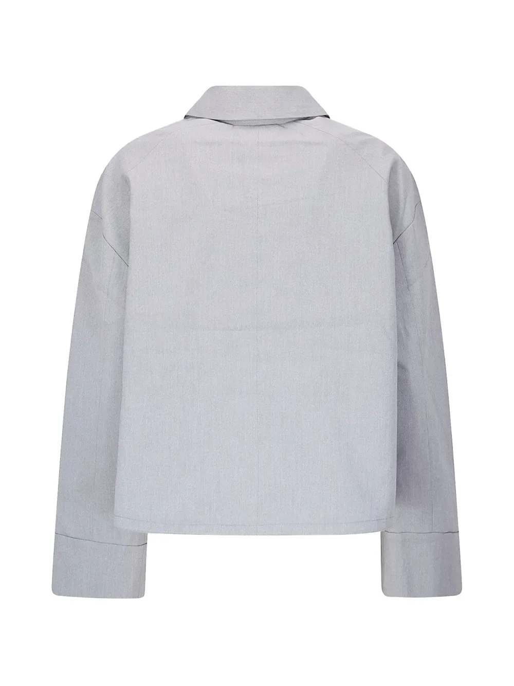 Металлическо-серый цвет, застежка на пуговицы, воротник, накладные карманы спереди, длинные рукава, широкие манжеты