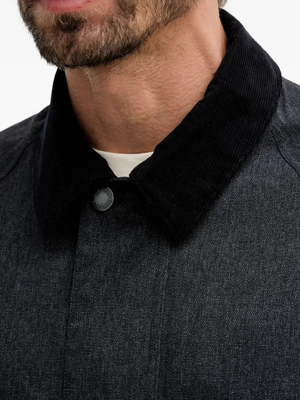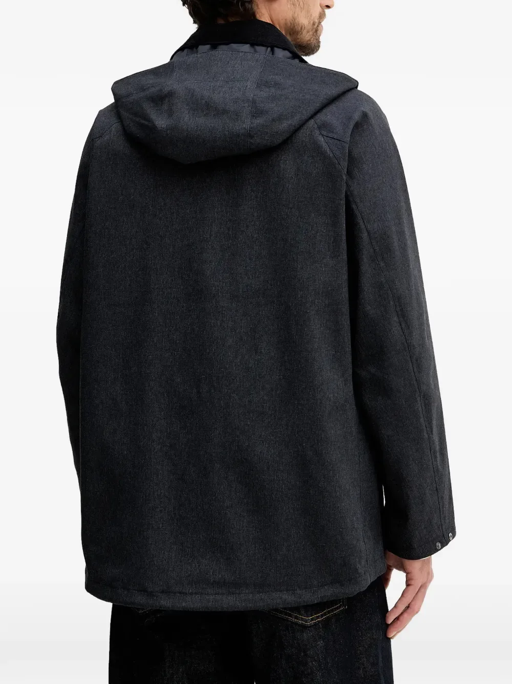 Темно-синий вельветовый воротник, застежка на кнопки, накладные карманы с клапанами, брендированные кнопки, съемный капюшон