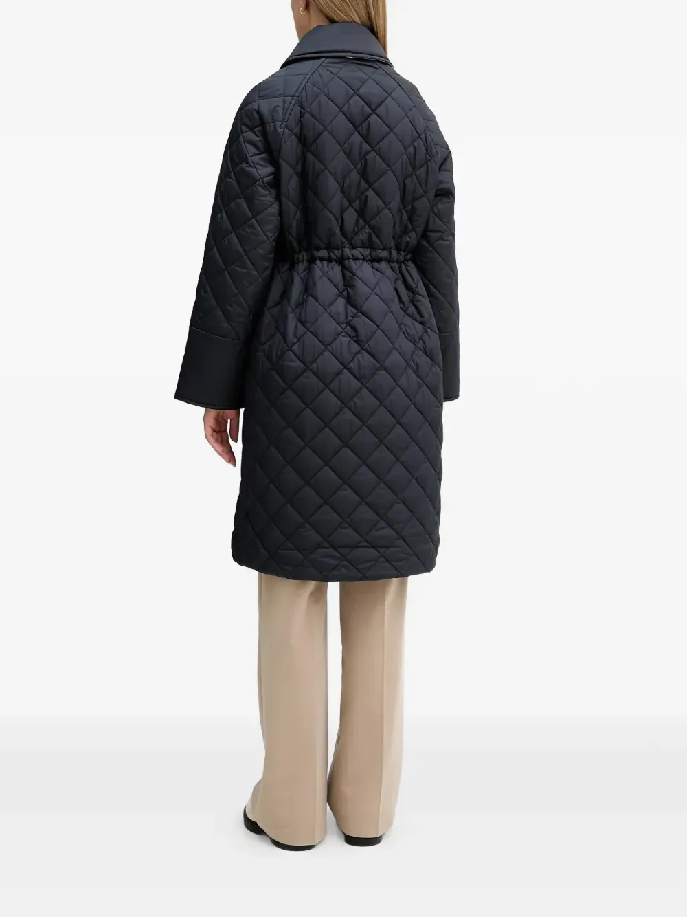 Темно-синий стеганый дизайн, передние клапанные карманы, регулируемый шнурок на талии, застежка на пуговицы, отложной воротник