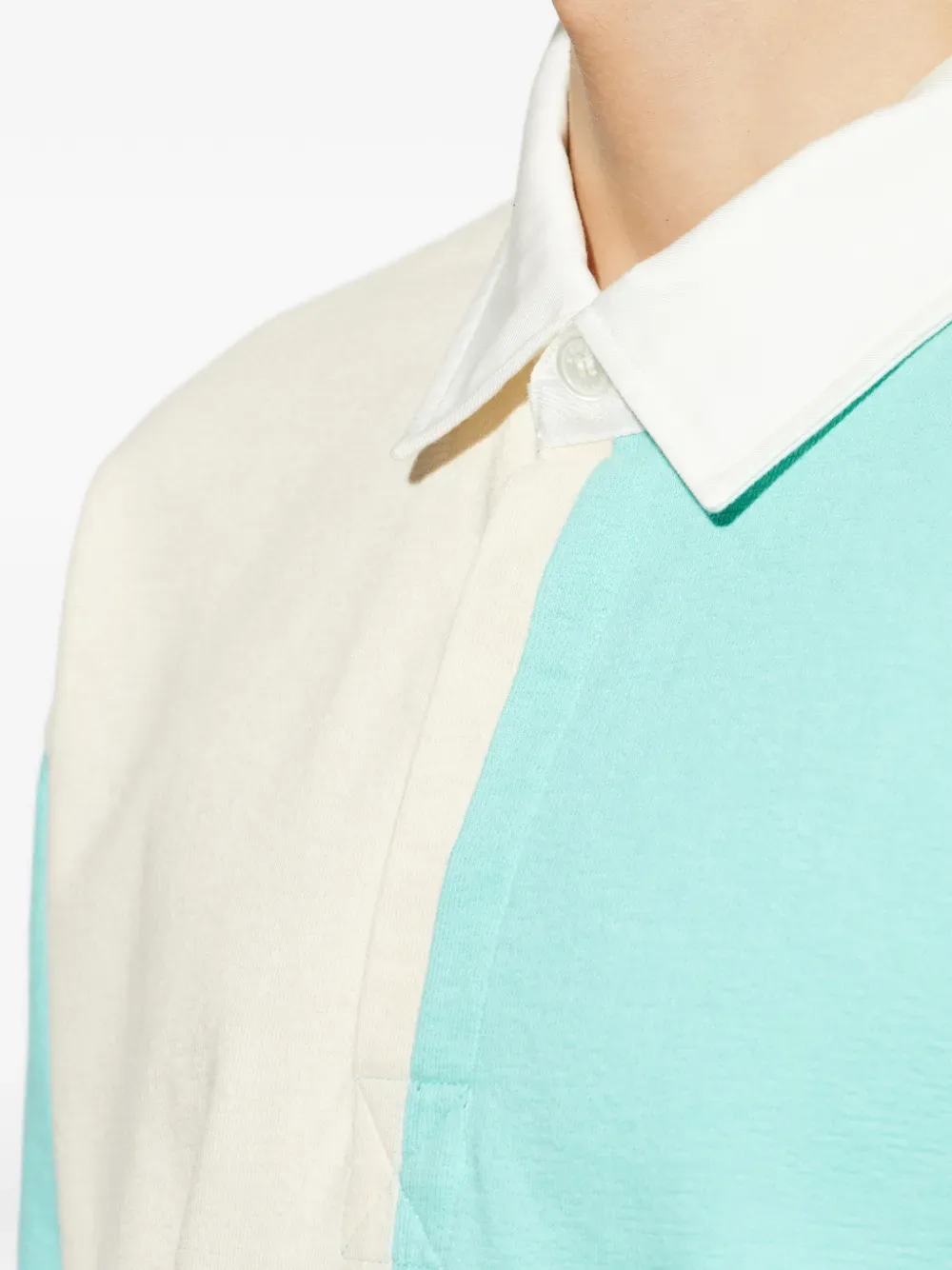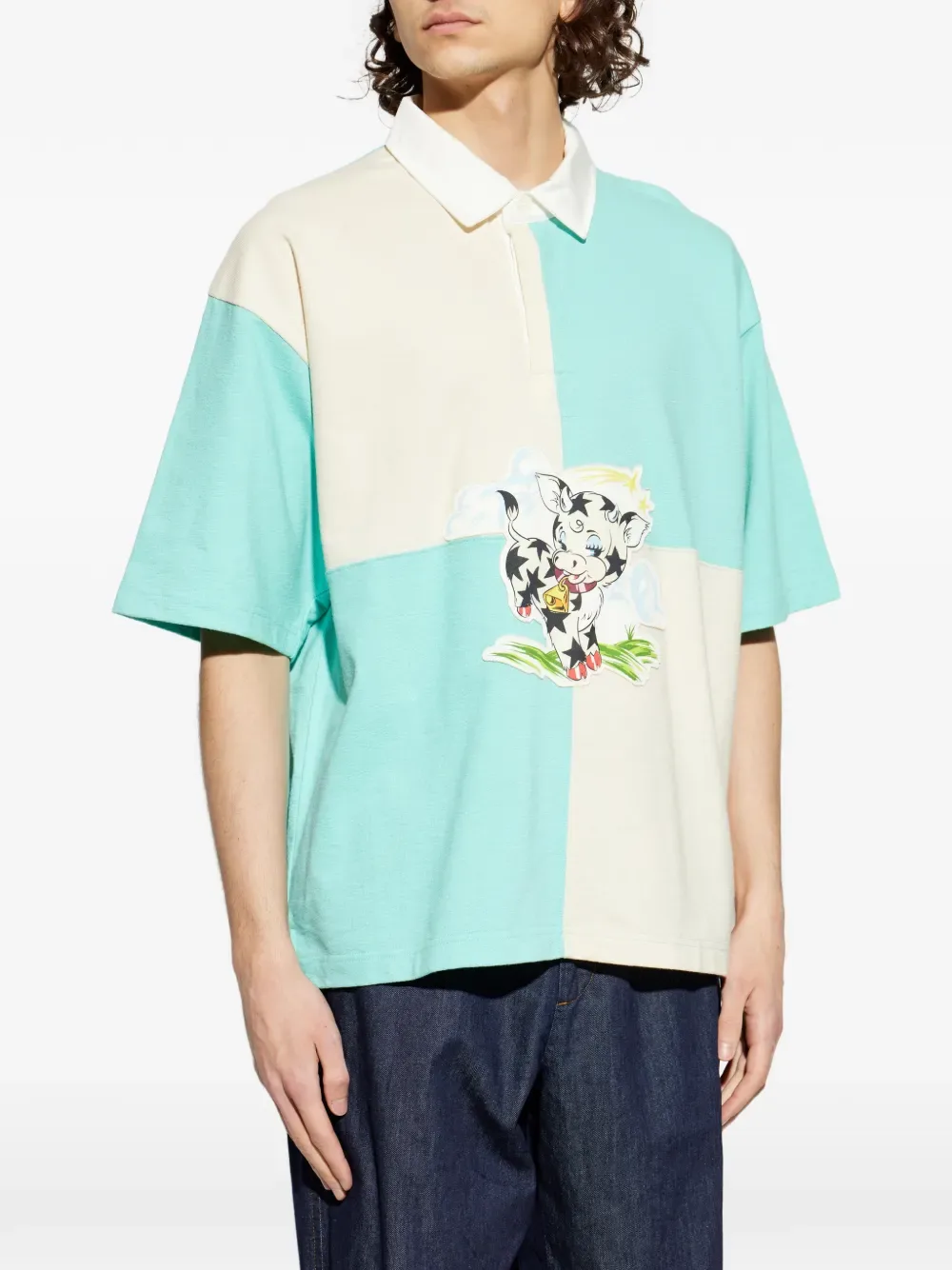 Синий поло с многоцветными вставками, с мультяшным принтом, отложным воротником, короткими рукавами, из хлопка