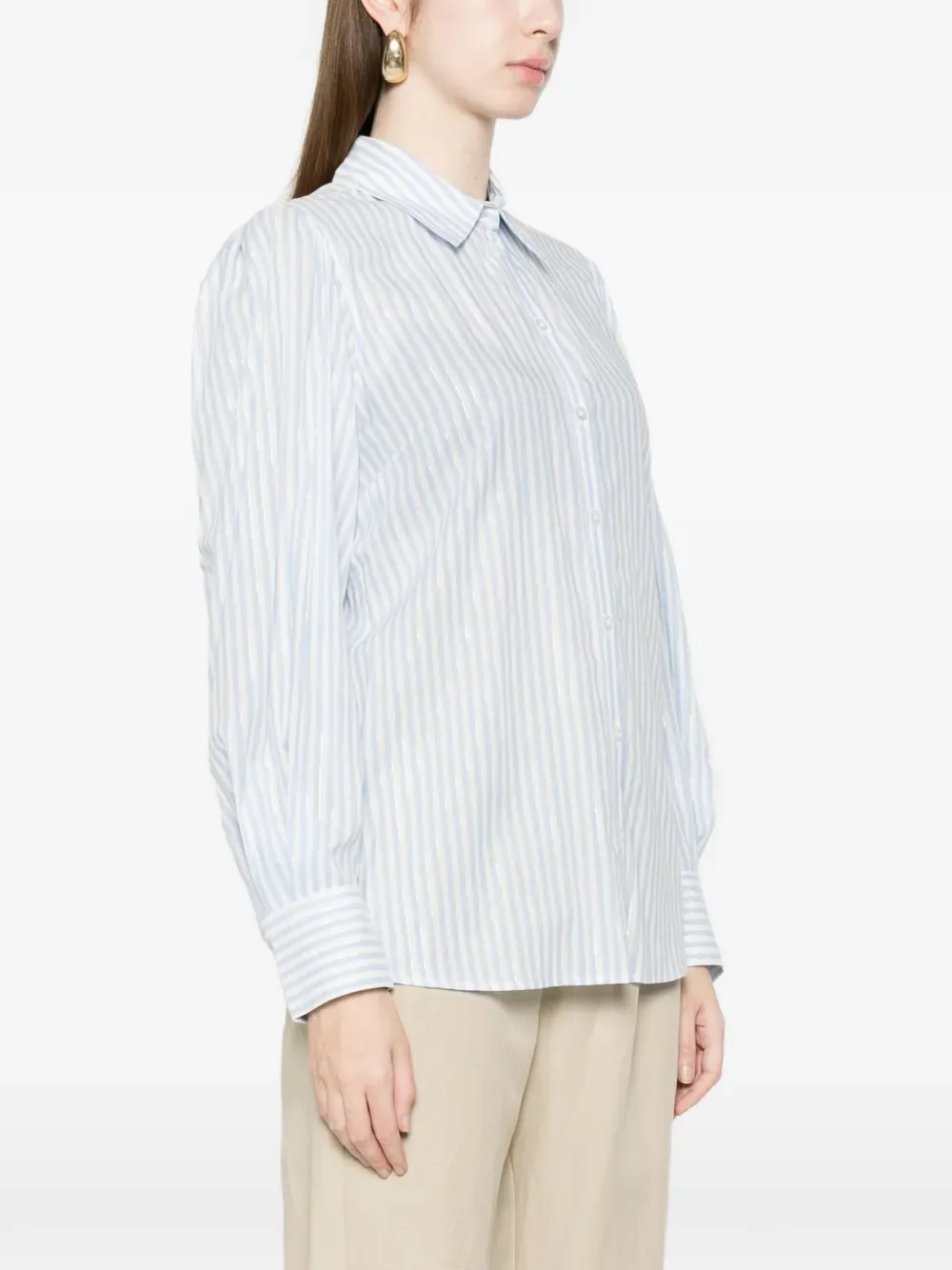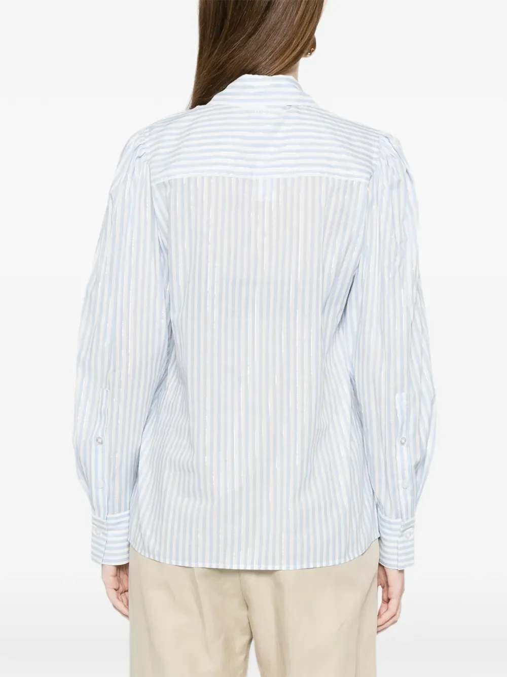 Синие и белые вертикальные полосы, застегивается на пуговицы, длинные рукава, манжеты на пуговицах, заостренный воротник