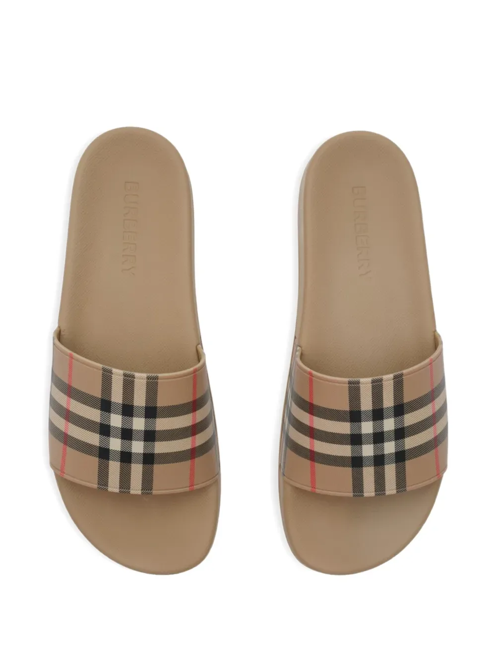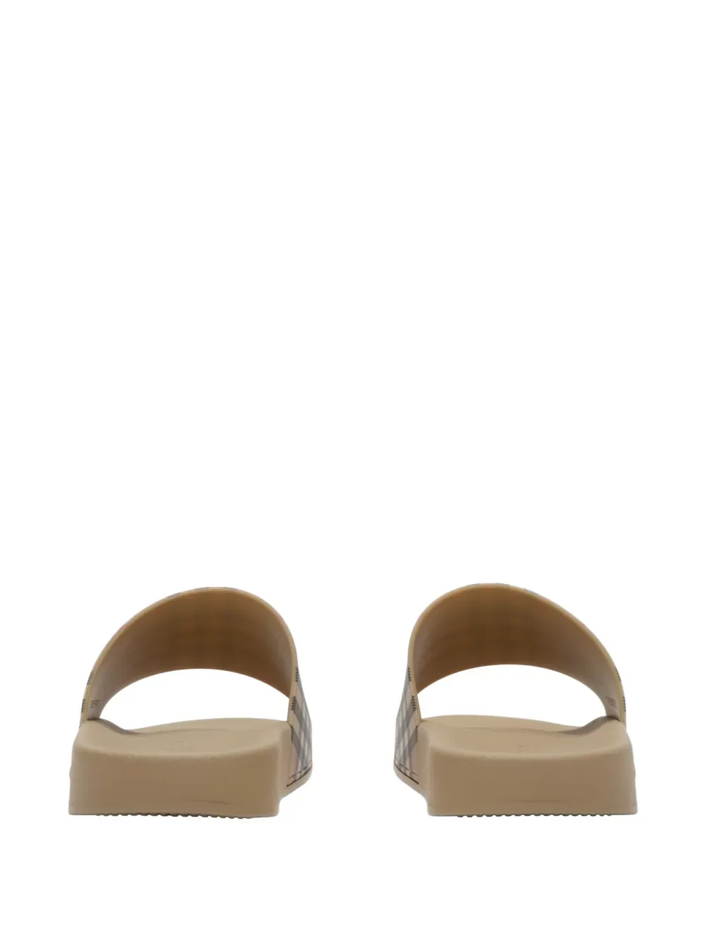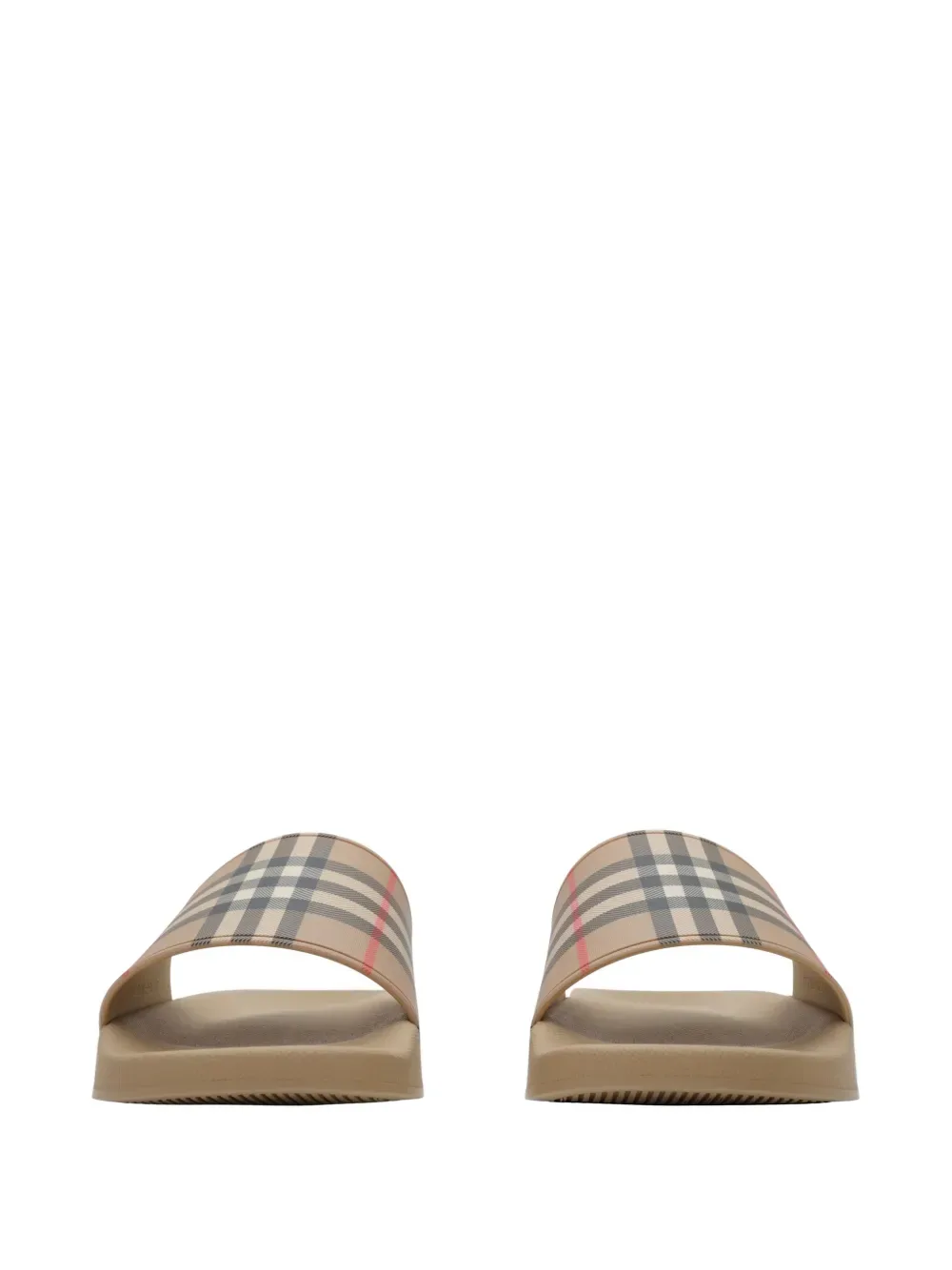 Пара слайдеров, произведенных в Италии, с фирменным принтом Burberry Check в архивном бежевом цвете; анатомическая стелька, тисненая надпись Burberry сбоку.