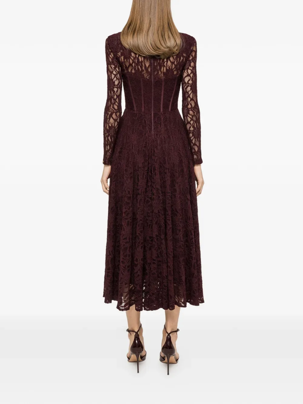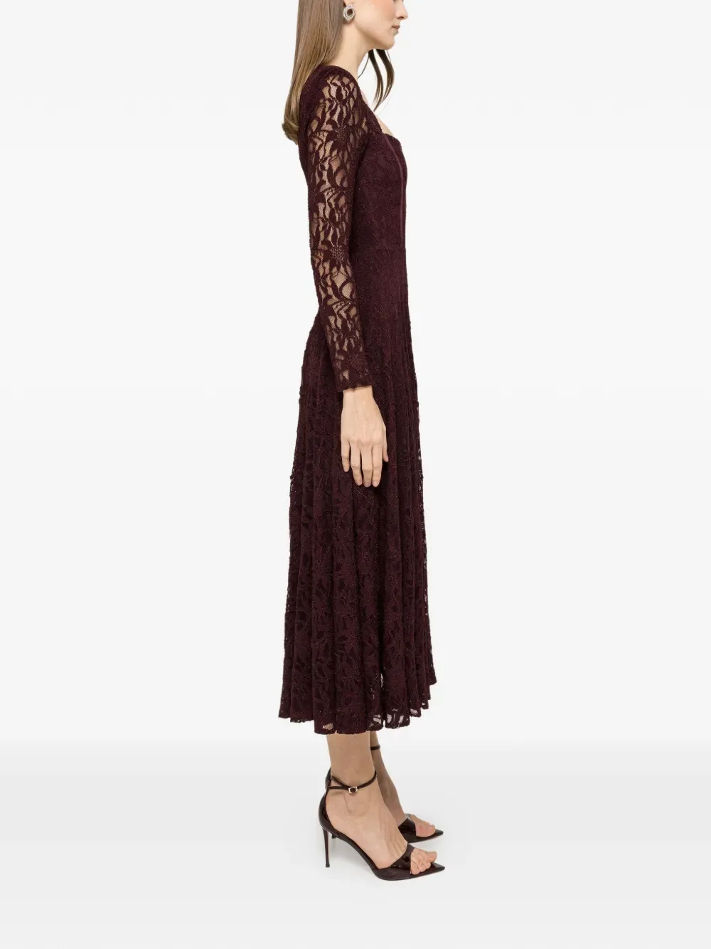 Красное кружевное платье миди с длинными рукавами, квадратным вырезом и панелями