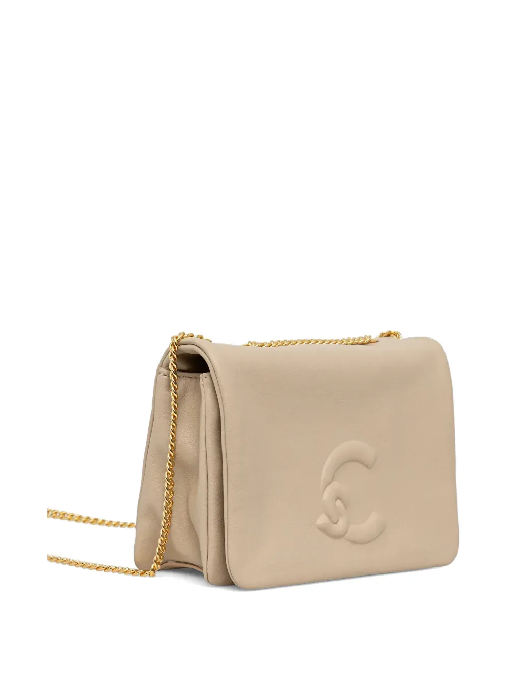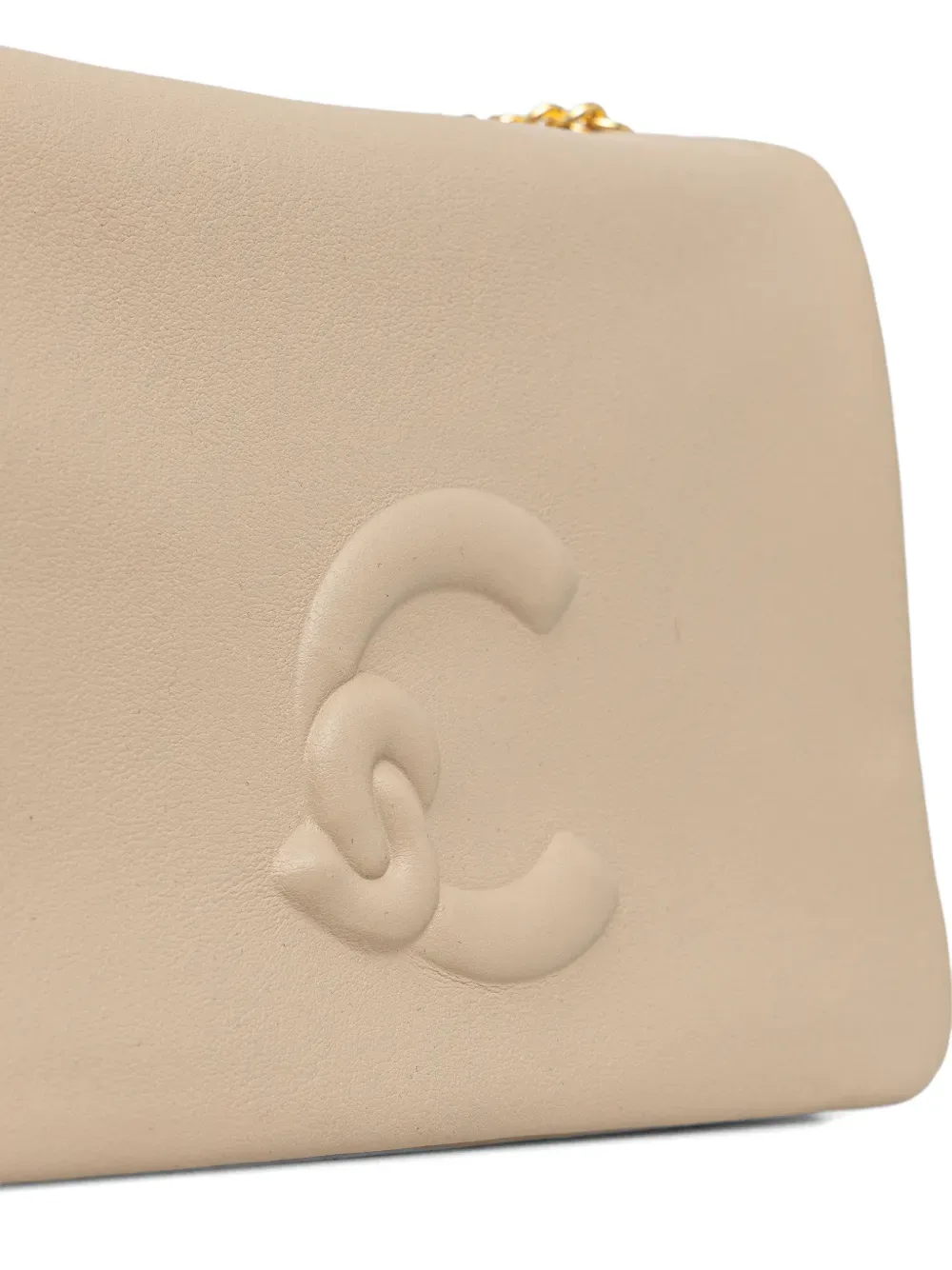 Бежевый цвет, ремень-цепочка, тисненый логотип, клапан на кнопке, основное отделение, фурнитура цвета золота